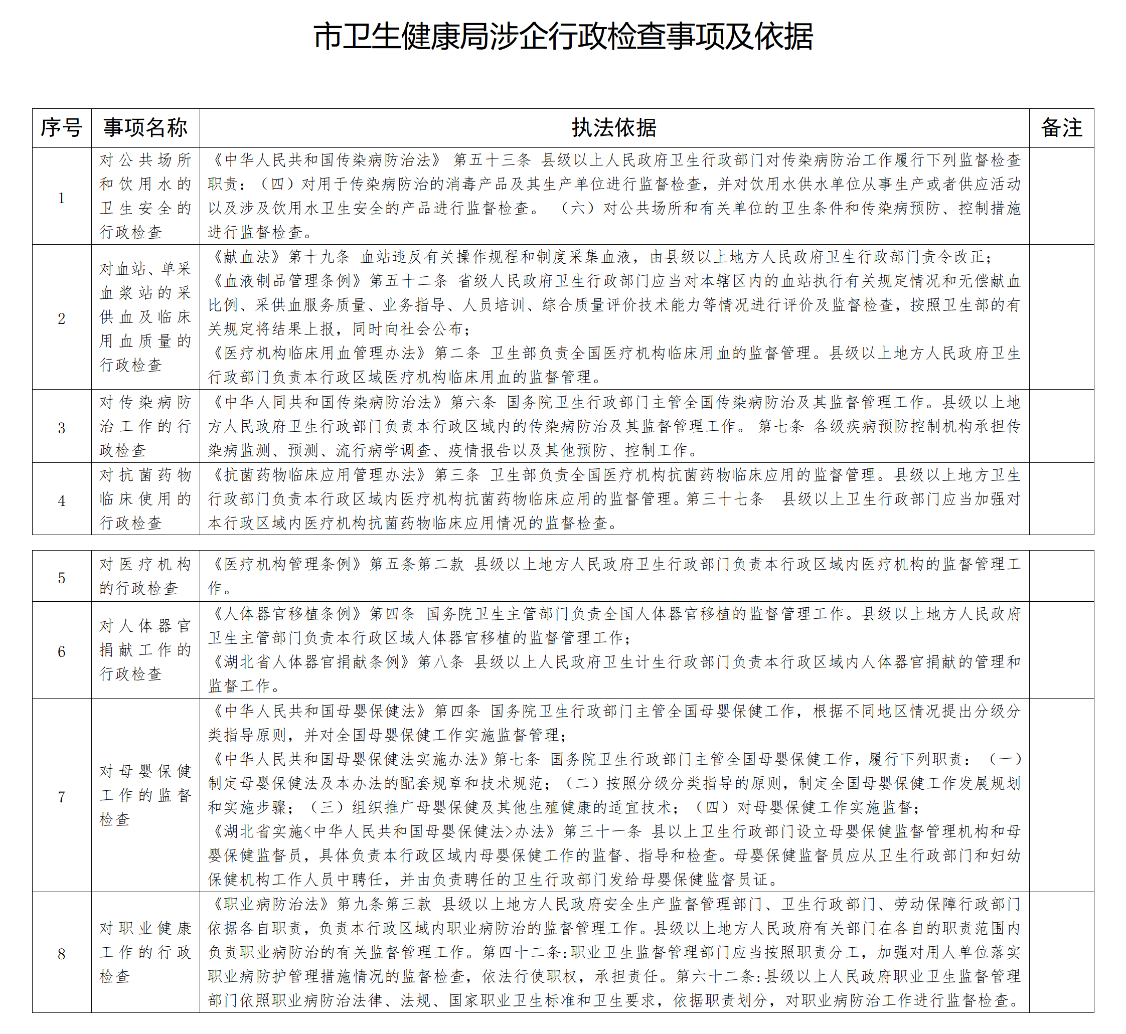 市卫生健康局涉企行政检查事项及依据