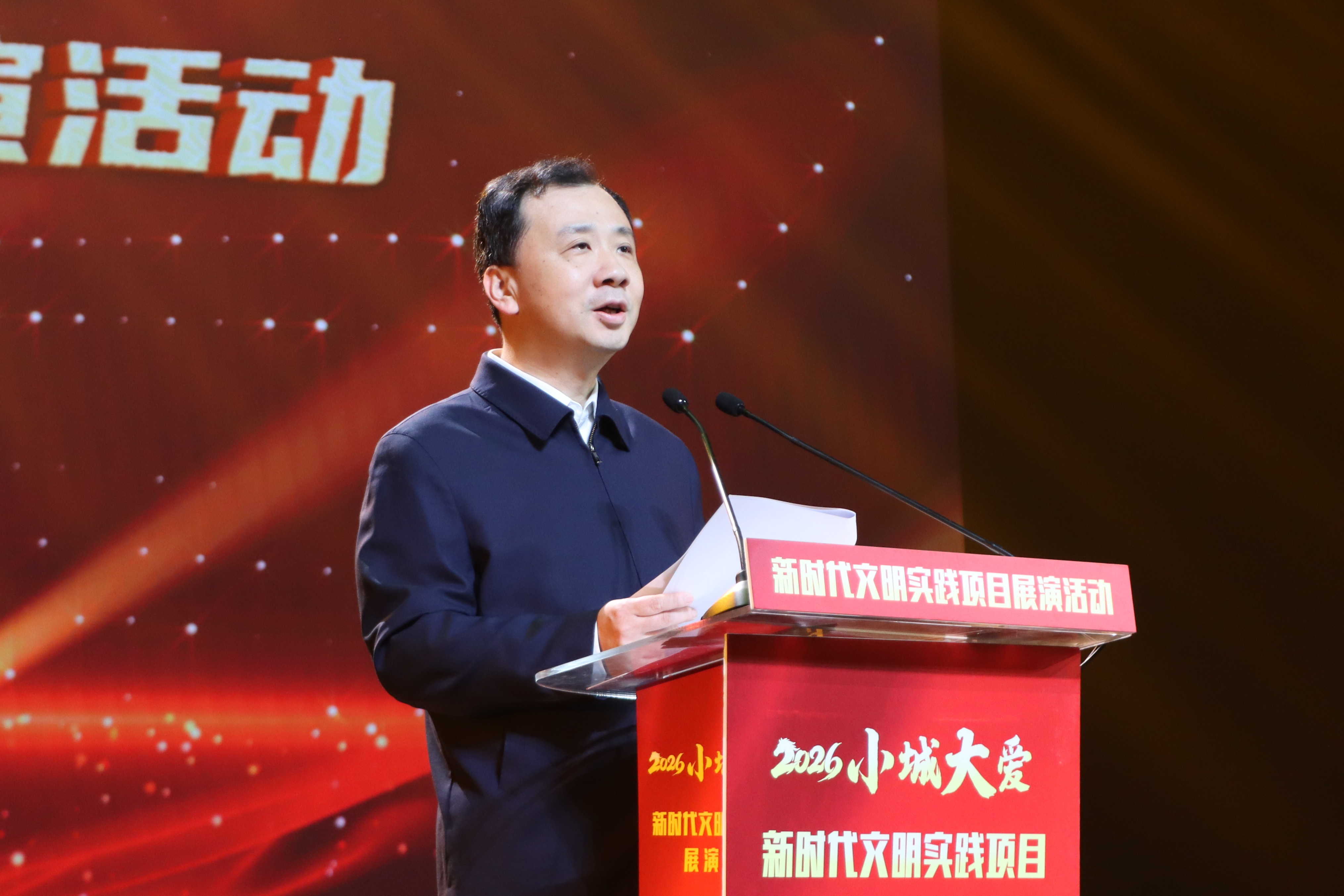 会议还进行了2026年小城大爱新时代文明实践展演活动;潘小进等市领导为20个新时代文明实践分中心代表授旗。