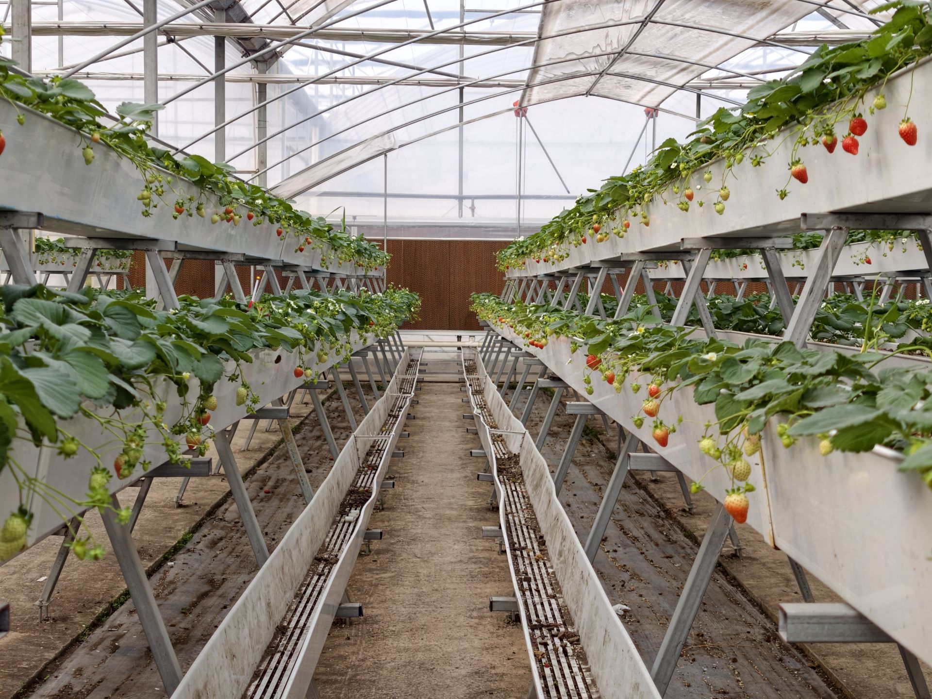 “传统地栽草莓容易遇到连作障碍和土传病害等问题,而我们采用的空中栽培模式,以基质代替土壤,从根本上切断了土传病虫害的传播途径。”技术负责人胡文锋轻轻托起一株草莓介绍道,这些草莓的根系生长在特制栽培槽中,通过水肥一体化系统精准供给养分,确保每一株草莓都能获得均衡的营养。