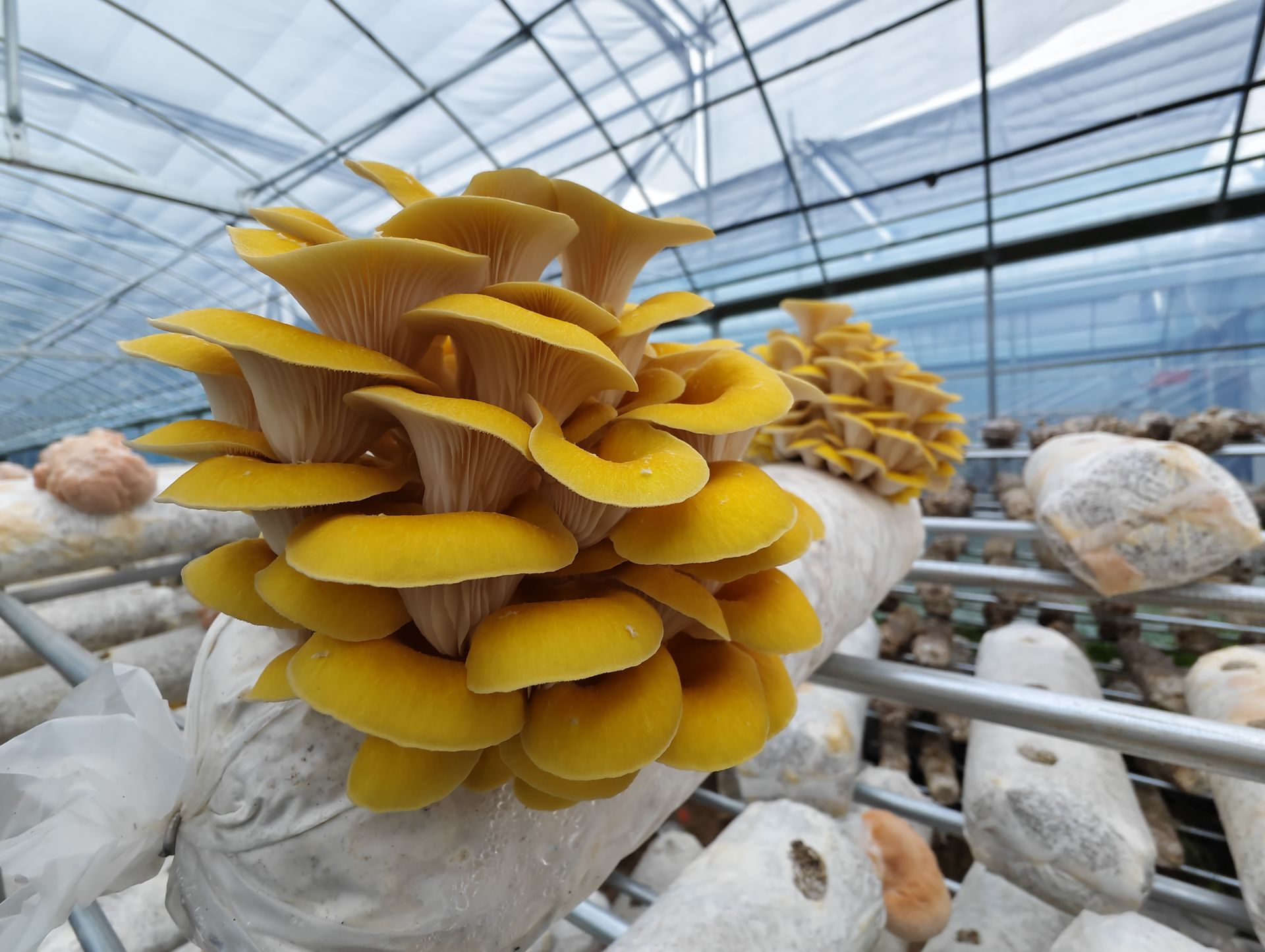 目前基地共有98个标准化大棚,除了羊肚菌,还培育榆黄蘑、灵芝、猴头菇、竹荪等多个特色菌种,错峰上市、多品类互补,一年到头都有菇出。
