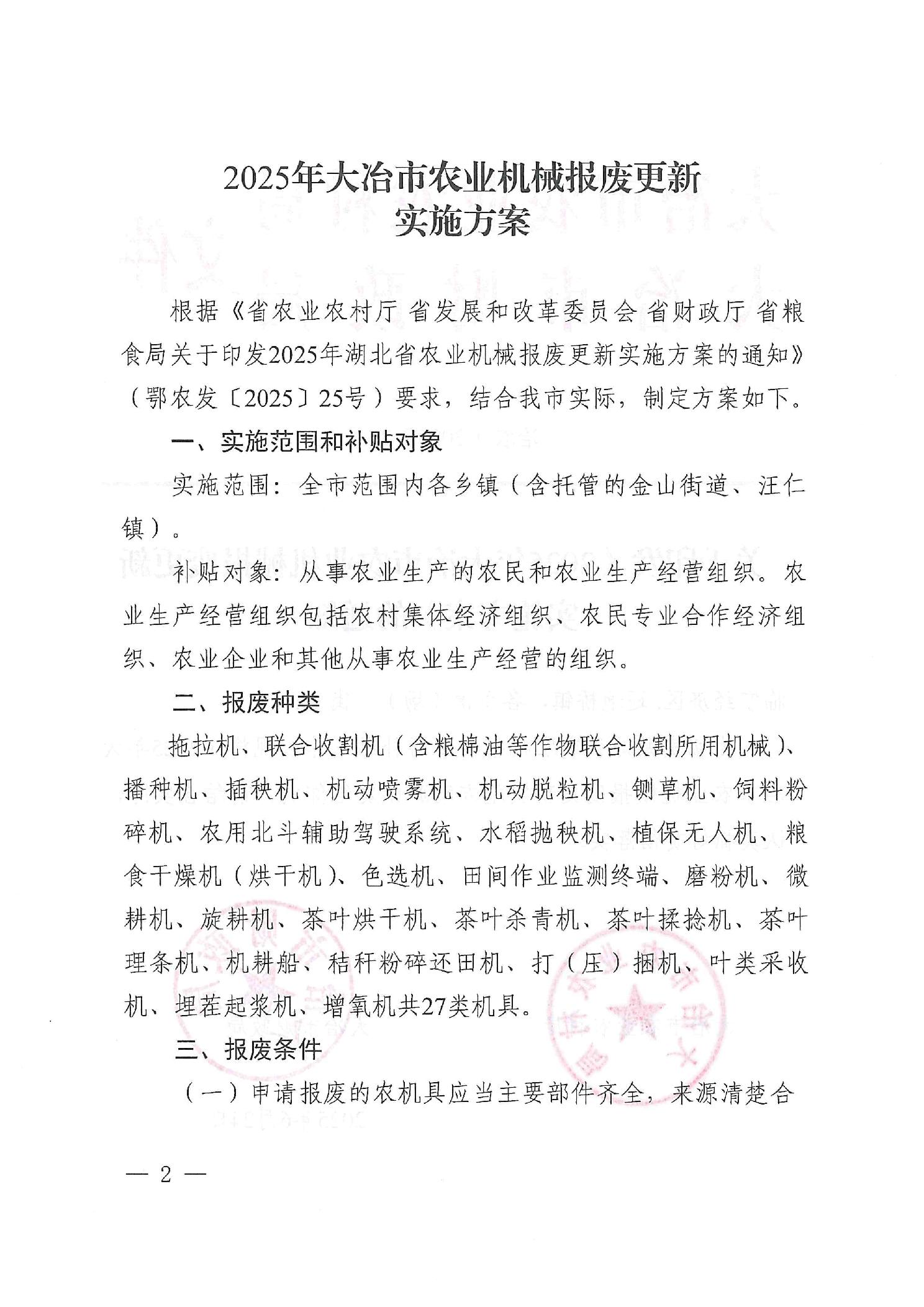 关于印发《2025年大冶市农业机械报废更新实施方案》的通知