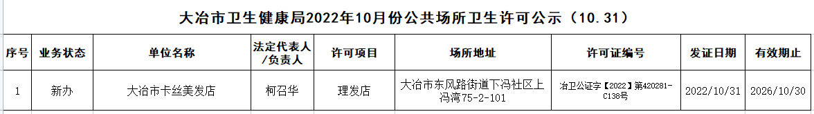 大冶市卫生健康局2022年10月份公共场所卫生许可公示(10.31)