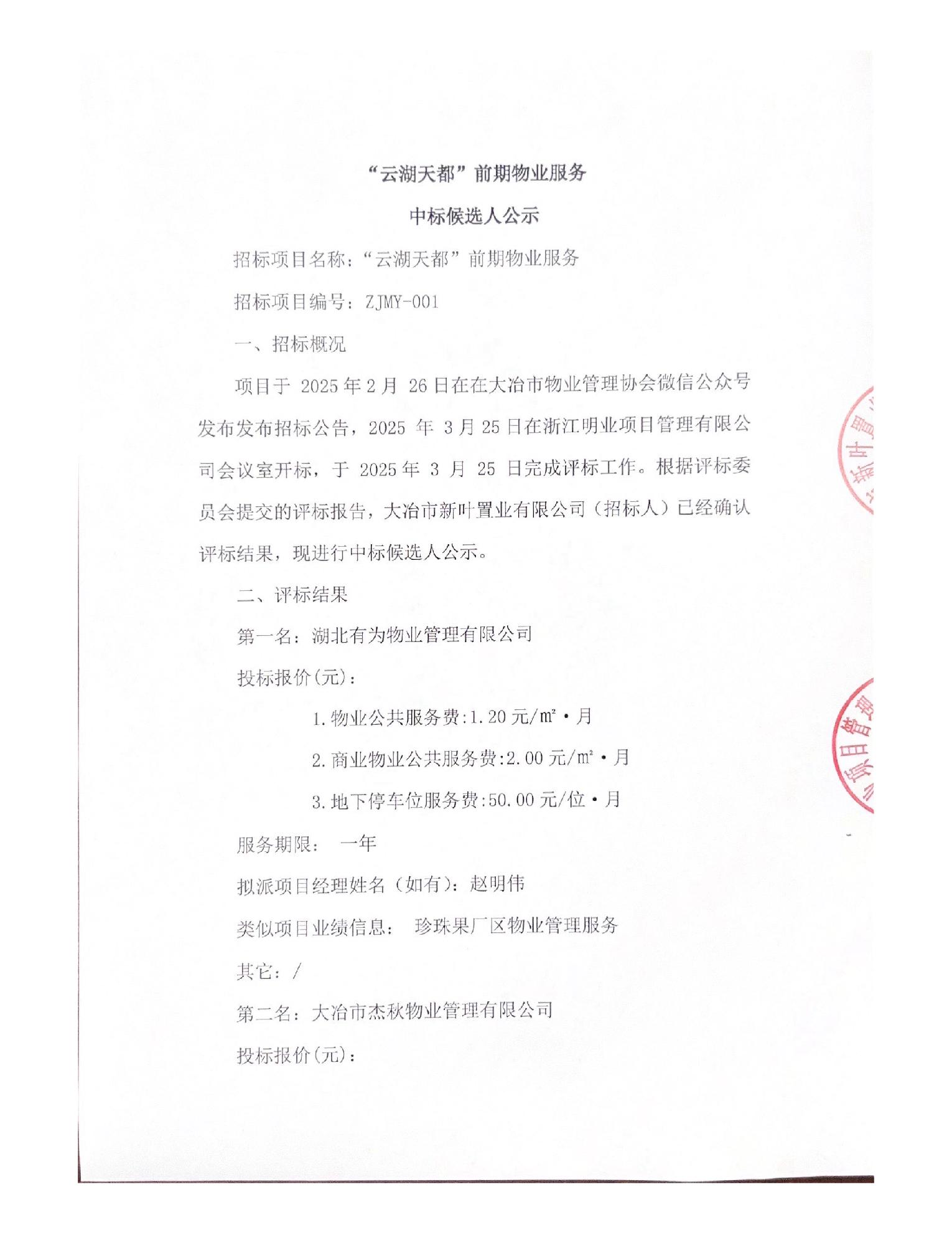 “云湖天都”前期物业服务中标候选人公示