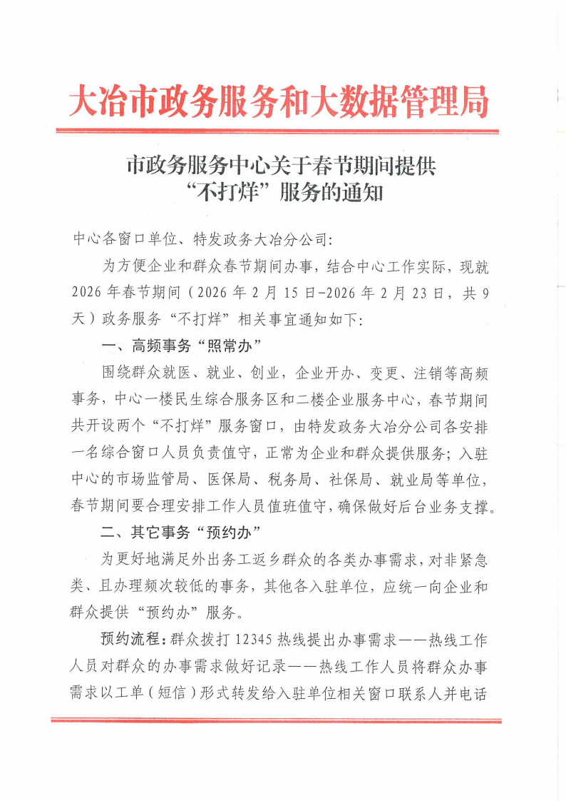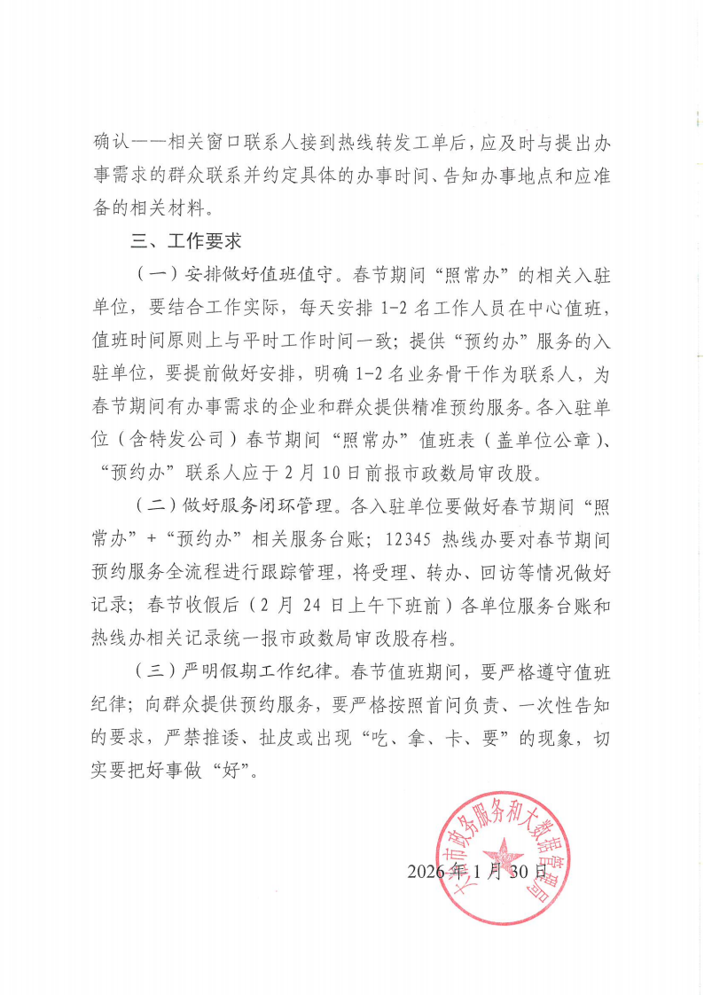 市政务服务中心关于春节期间提供“不打烊”服务的通知