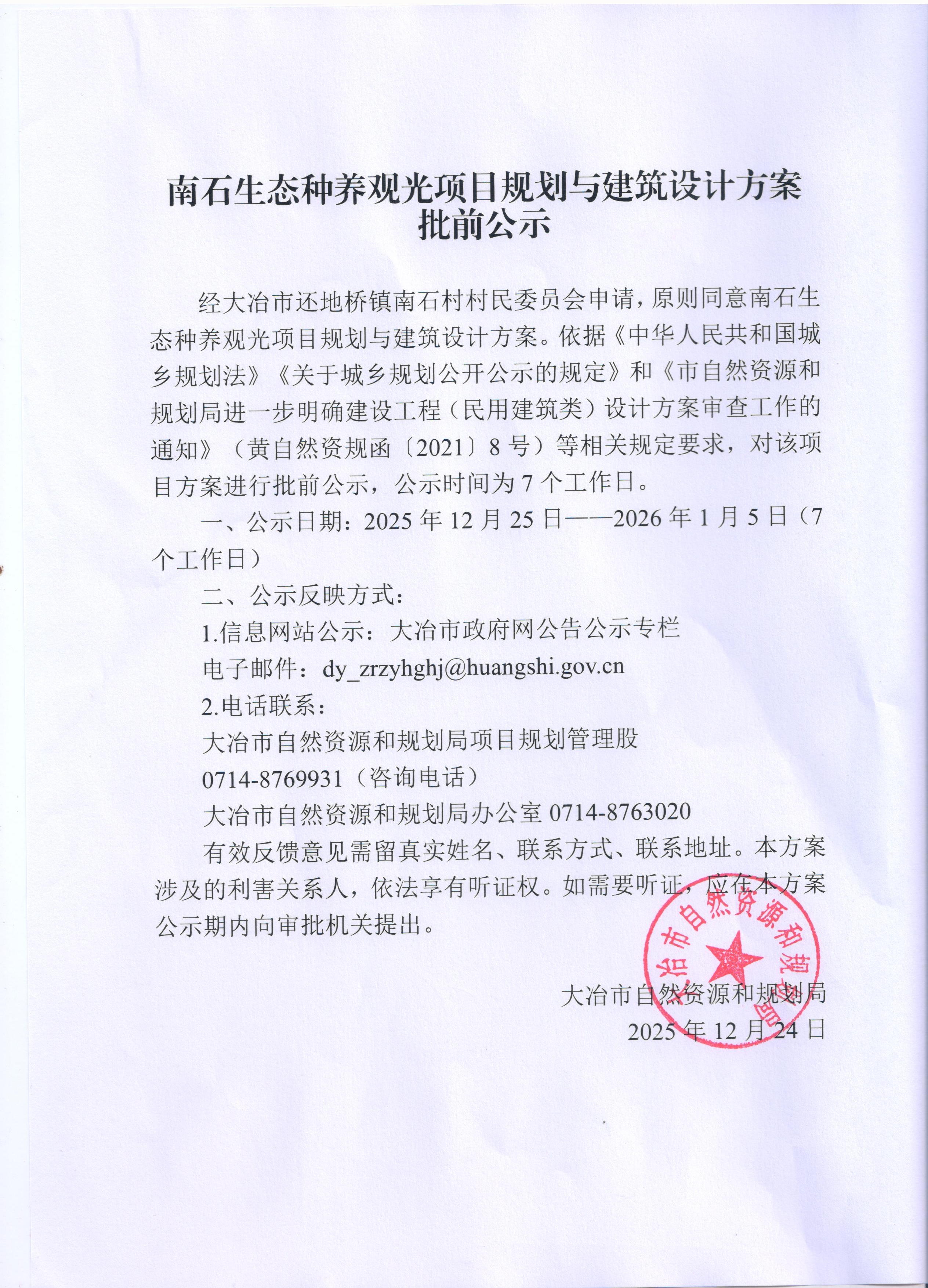 经大冶市还地桥镇南石村村民委员会申请,原则同意南石生态种养观光项目规划与建筑设计方案。依据《中华人民共和国城乡规划法》《关于城乡规划公开公示的规定》和《市自然资源和规划局进一步明确建设工程(民用建筑类)设计方案审查工作的通知》(黄自然资规函〔2021〕8号)等相关规定要求,对该项目方案进行批前公示,公示时间为7个工作日。