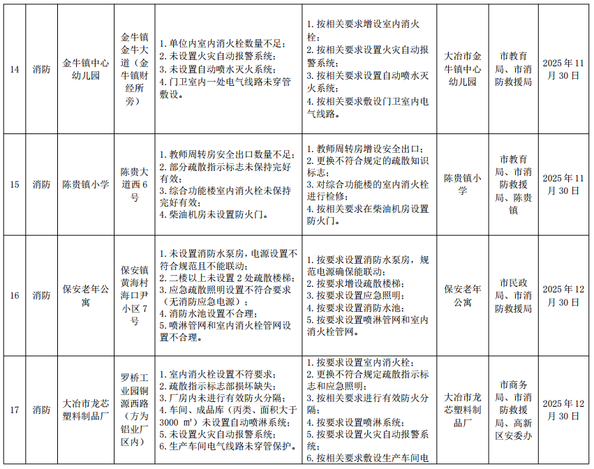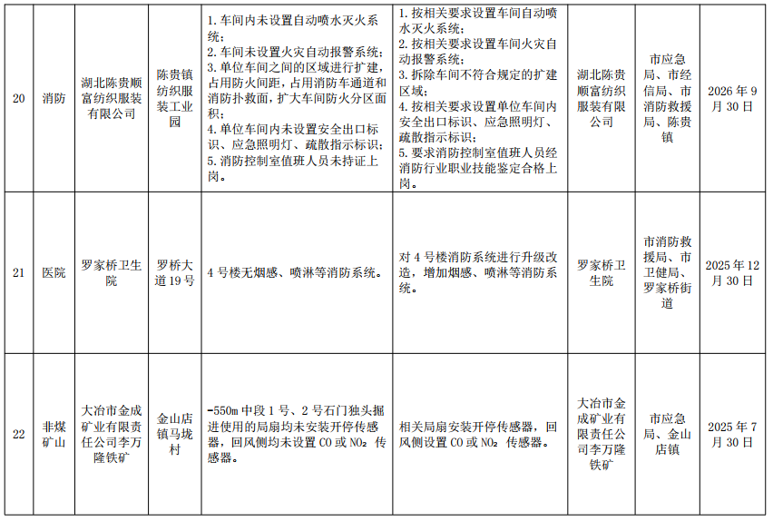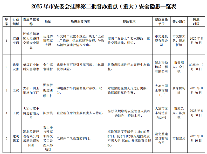 为认真落实习近平总书记关于安全生产重要论述精神,聚焦重大事故隐患排查整治,切实消除重大安全隐患,有效防范和遏制各类事故发生,进一步推动安全生产治本攻坚三年行动走深走实,根据《湖北省安全生产重大事故隐患挂牌督办办法》《大冶市安全生产重大事故隐患挂牌跟踪督办制度》,经各乡镇、市安委会相关成员单位上报、核查,市安防委会决定对23处重点(重大)安全隐患予以挂牌督办,现予以公示。