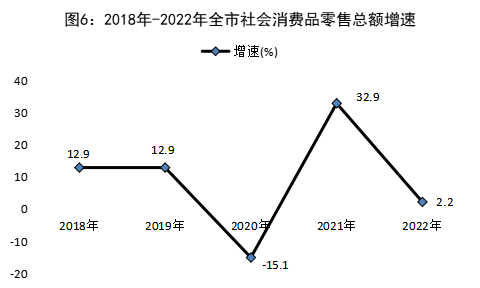 全年全市(全域口径)社会消费品零售总额392.02亿元,比上年增长2.2%。