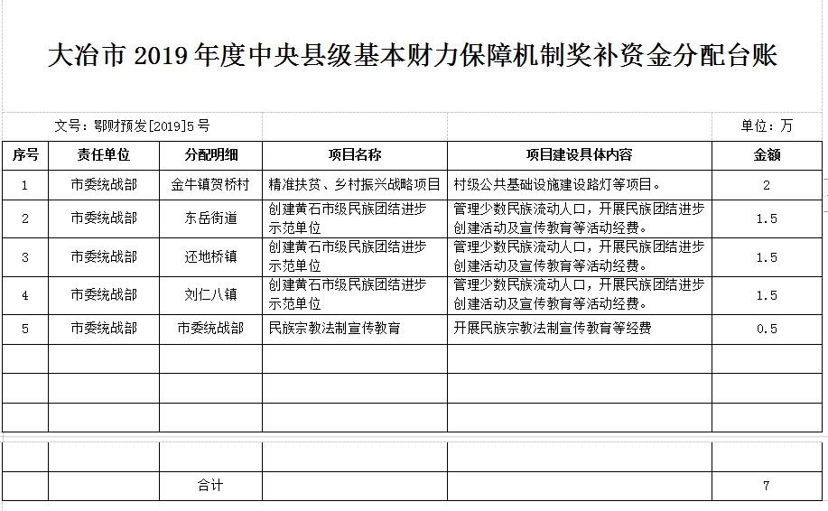 附表1:大冶市2019年度中央县级基本财力保障机制奖补资金分配台账