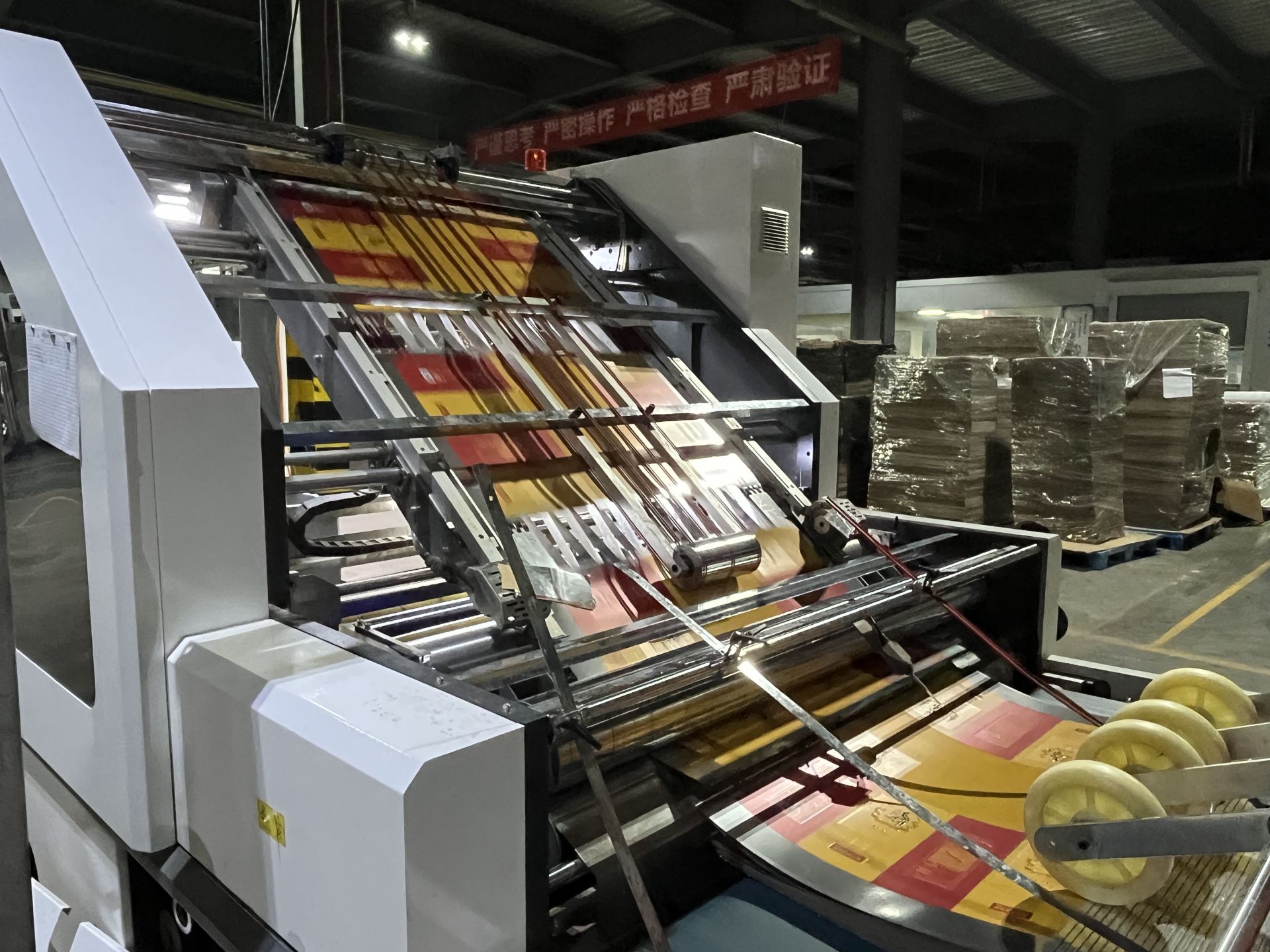 从可见的物理防伪到不可见的数字防伪,细节优化的实现,离不开生产设备的精密支撑。劲佳科技车间内,一台长达25米的德国高堡12+2色印刷机正全速运行。这台顶尖设备能在单次印刷过程中同步完成局部触感、冷烫、防伪纹理等多种复杂表面处理,时速高达18000张。既提高了效率,也通过减少工序转换降低了误差风险。