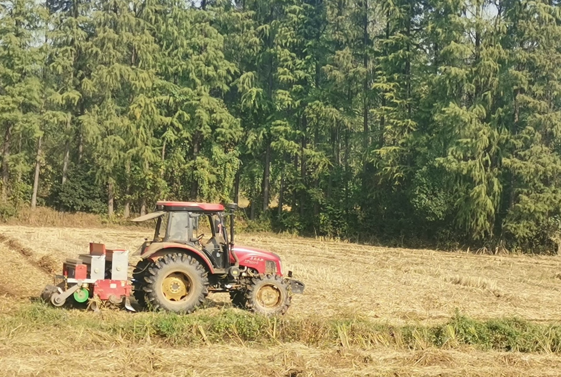 10月29日,在灵乡镇岩峰村上吴大畈,2台油菜播种机正在田间来回穿梭。金黄的稻田刚刚完成收割,农户们忙着往农机里添加油菜种子和肥料。伴随着机器的轰鸣声,播种机一次性完成翻耕、播种、施肥等多道工序,实现了全程机械化作业,大大提升了播种效率。