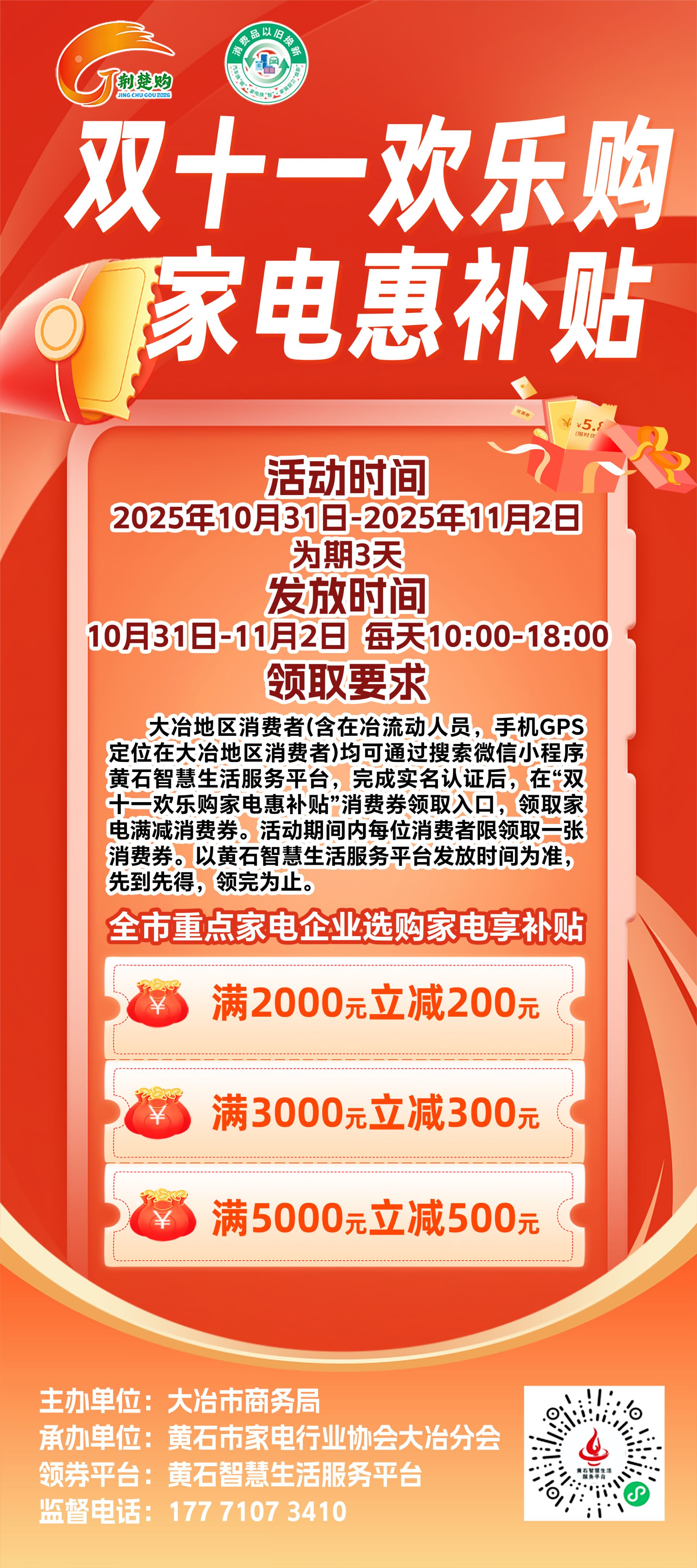 10月28日,记者从市商务局获悉,为持续推动家电以旧换新、提振消费市场活力,该局联合黄石市家电行业协会大冶分会,将于10月31日至11月2日开展“双十一欢乐购家电惠补贴”金秋家电促消费活动,将定向为大冶消费者发放总额120万元的专项补贴。