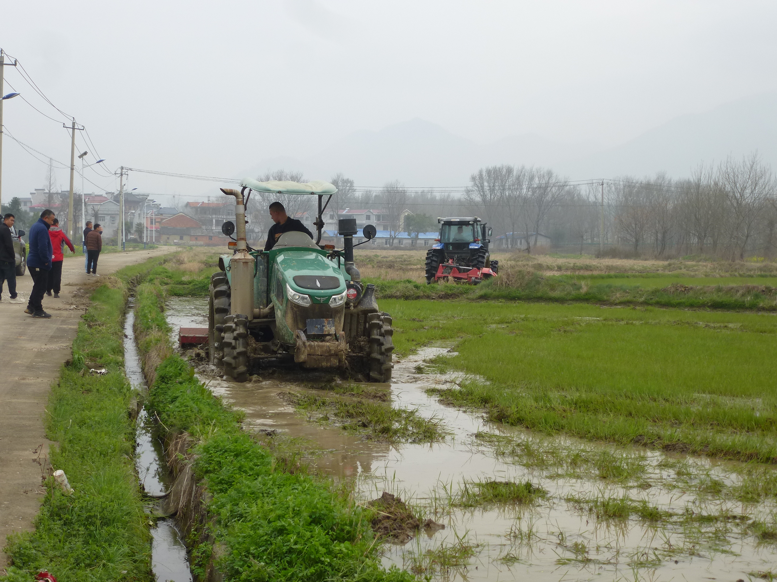 11日,全市春耕备耕现场观摩会在刘仁八镇八角亭村八角大畈举行。活动现场,4名农机手驾驶着旋耕机、筑埂机等农机具,对大片农田进行翻耕作业,为播种水稻提前打好基础。