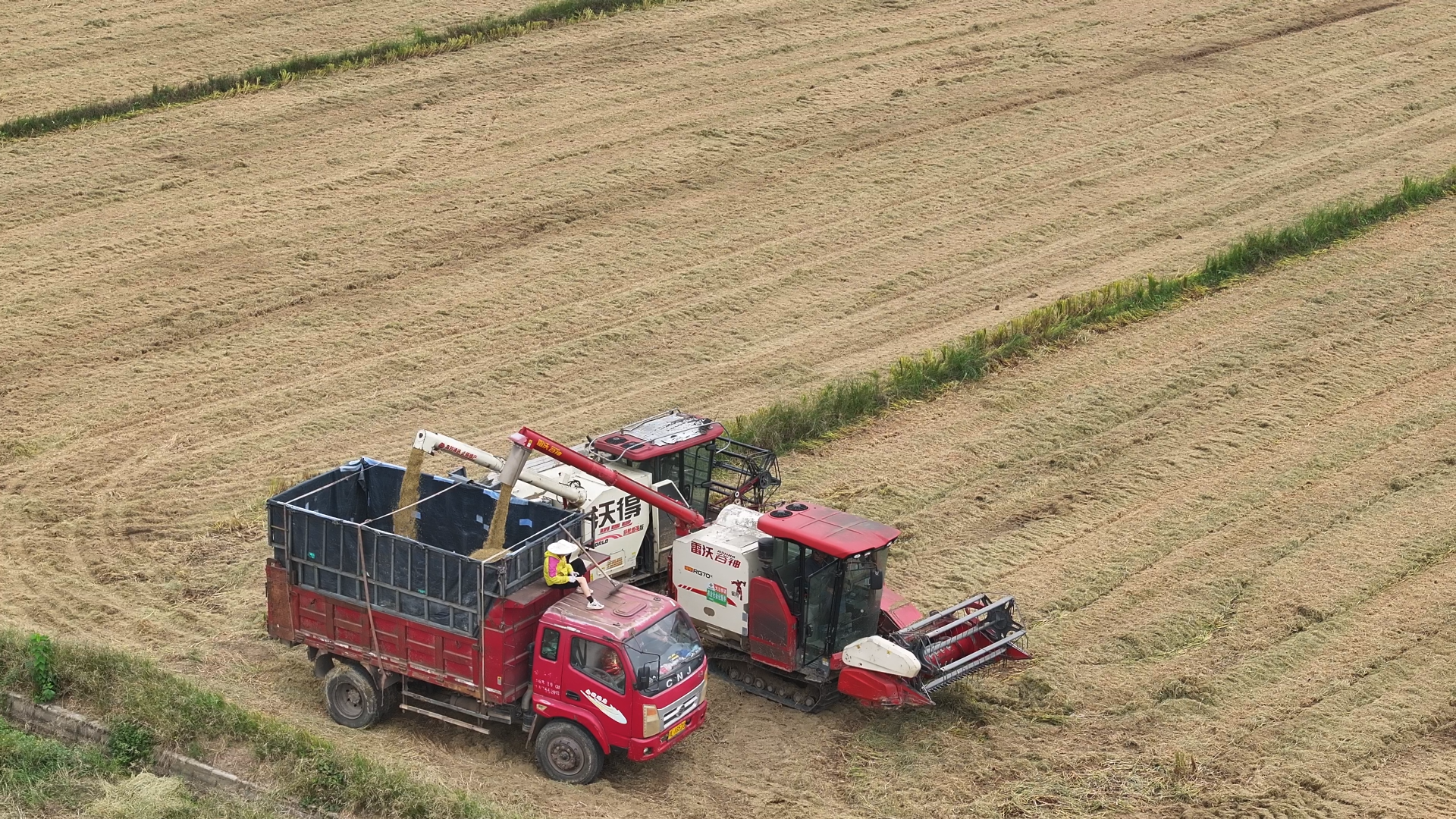 10月14日,金牛镇贺桥村夏家湾大畈上,三台收割机在稻田中来回穿梭,将饱满的稻穗卷入机腹。伴随着机器的轰鸣声,收割、脱粒、秸秆粉碎等工序一气呵成,金灿灿的稻谷被收入“囊中”,经自动化管道直接输送到运粮车上。