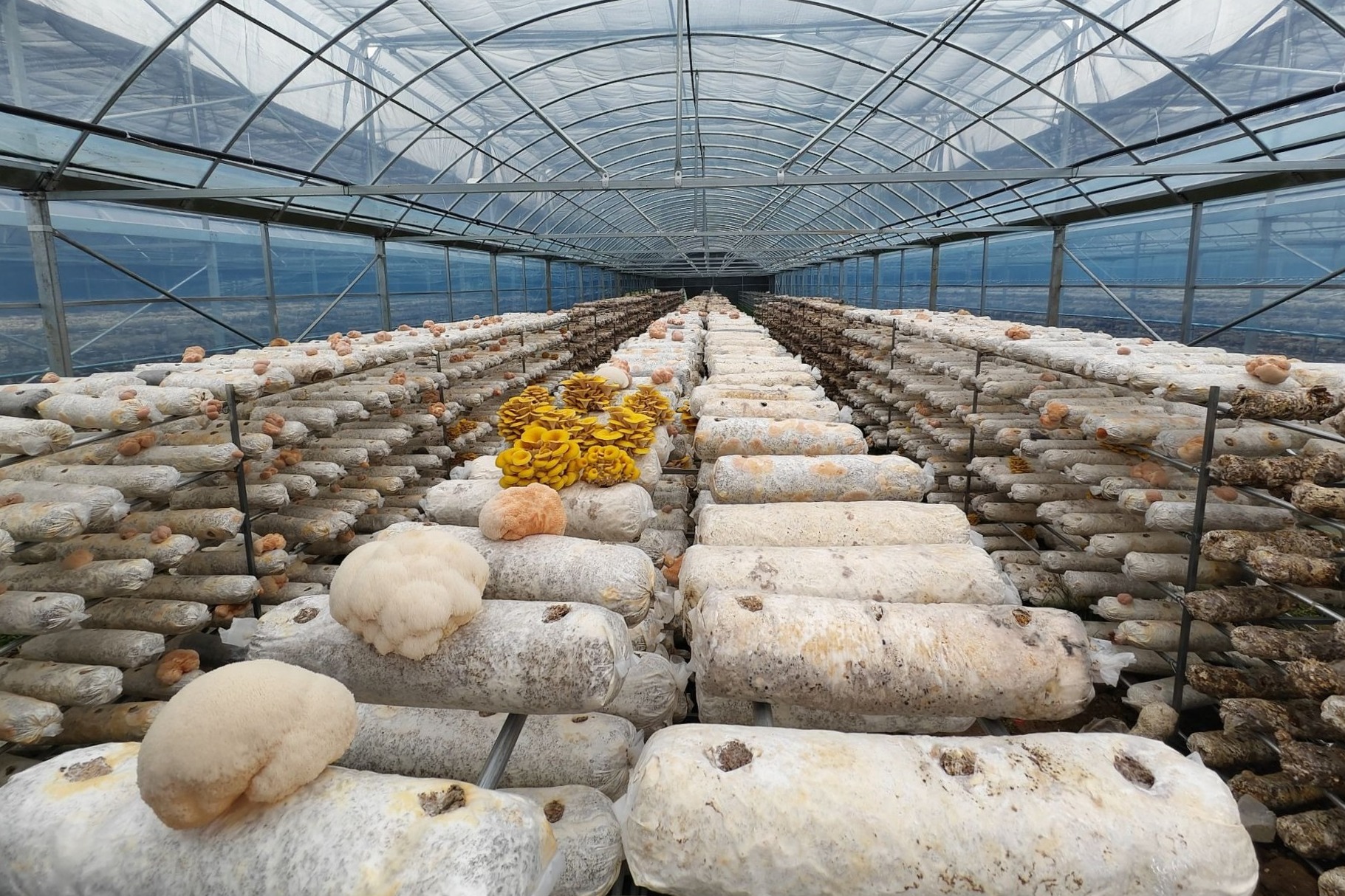 目前基地共有98个标准化大棚,除了羊肚菌,还培育榆黄蘑、灵芝、猴头菇、竹荪等多个特色菌种,错峰上市、多品类互补,一年到头都有菇出。