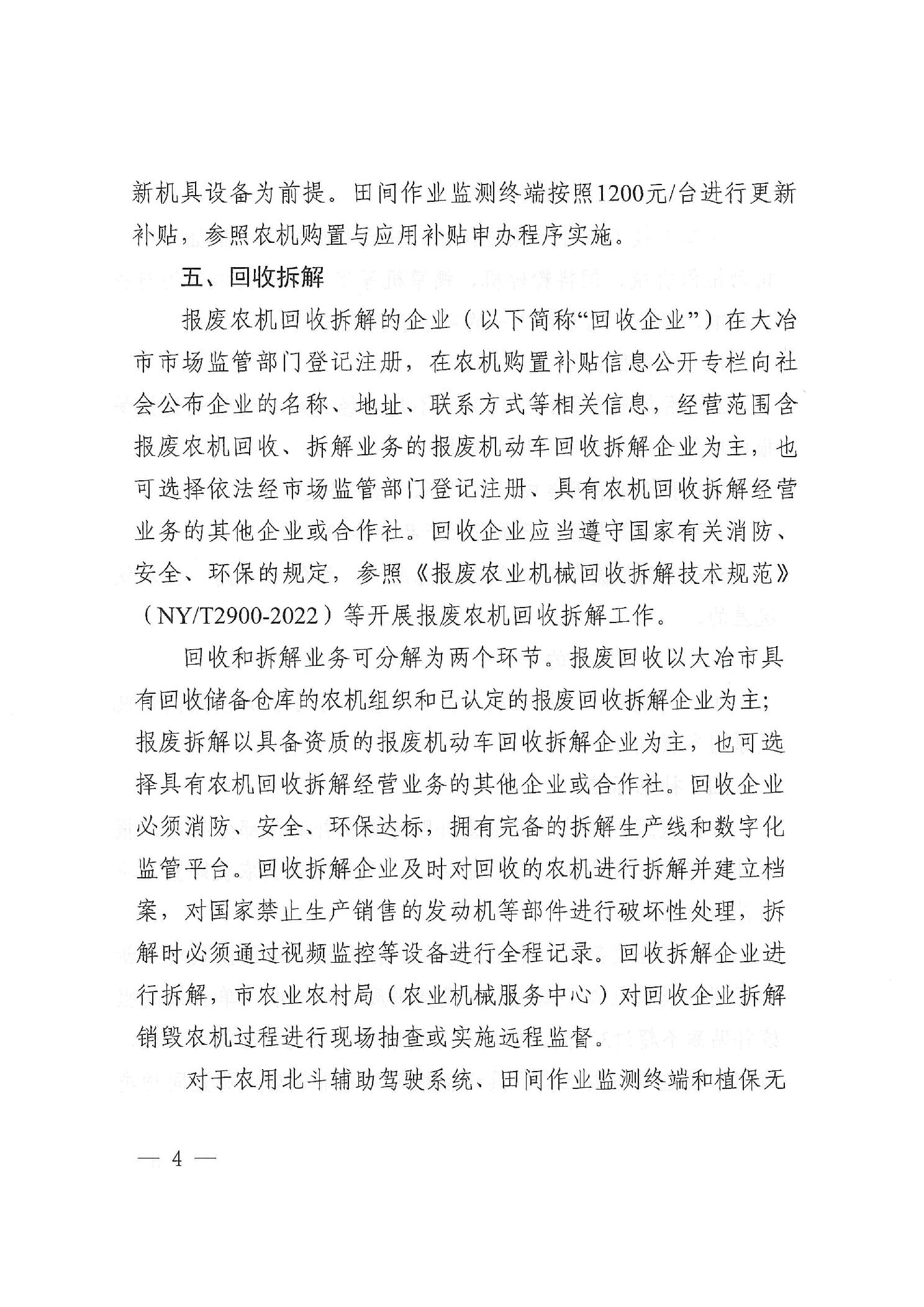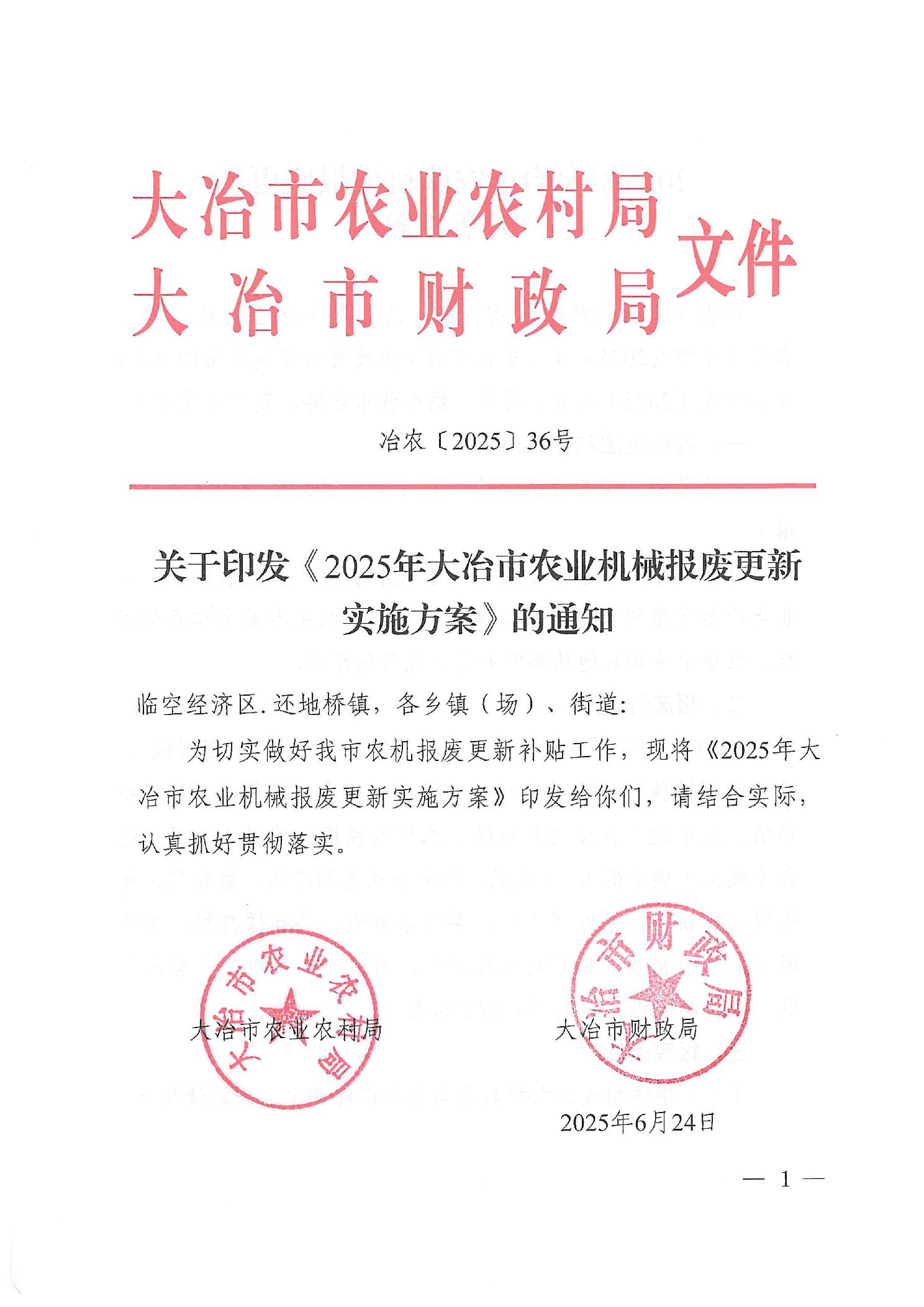 关于印发《2025年大冶市农业机械报废更新实施方案》的通知