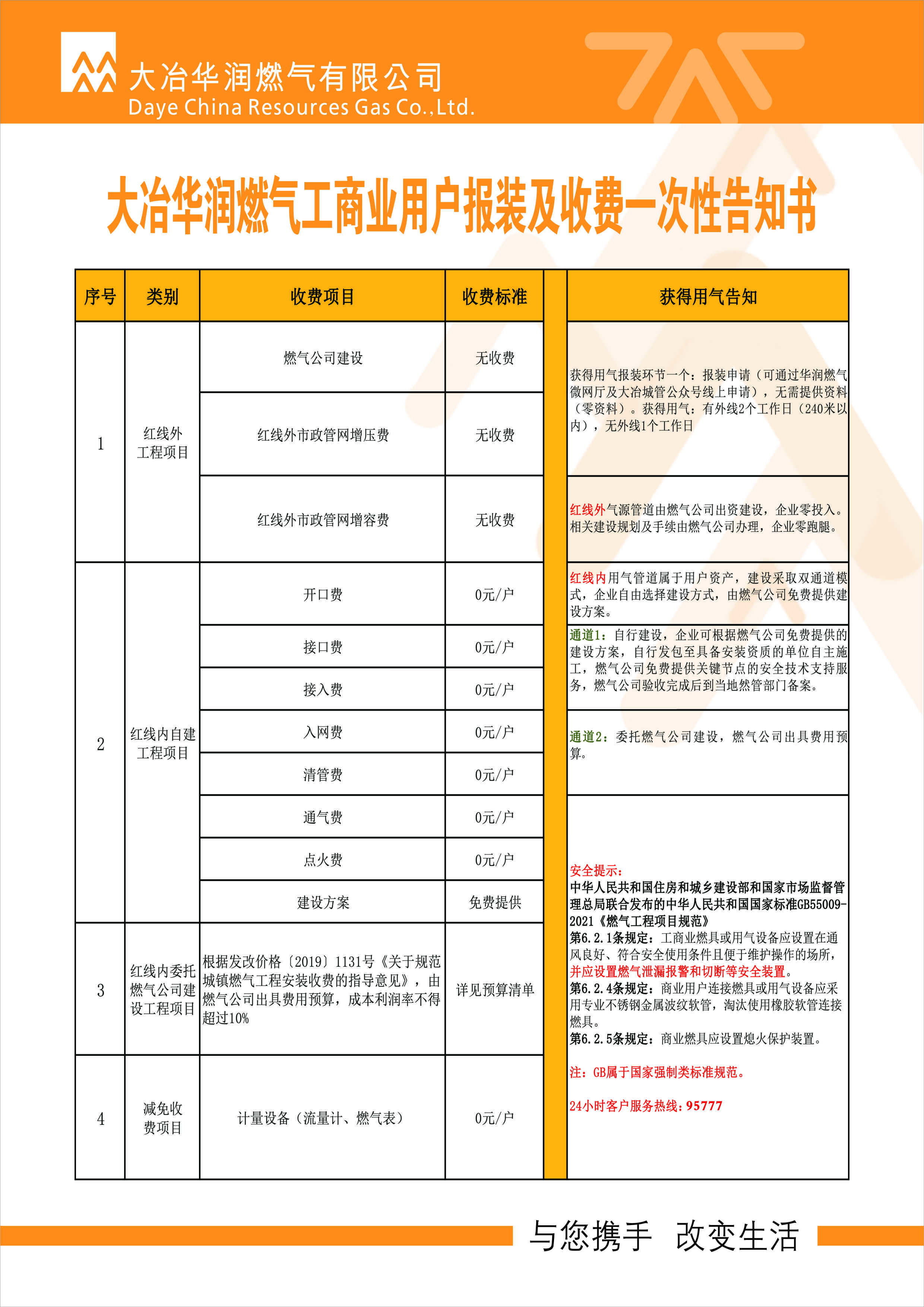 大冶华润燃气工商业用户报装及收费一次性告知书