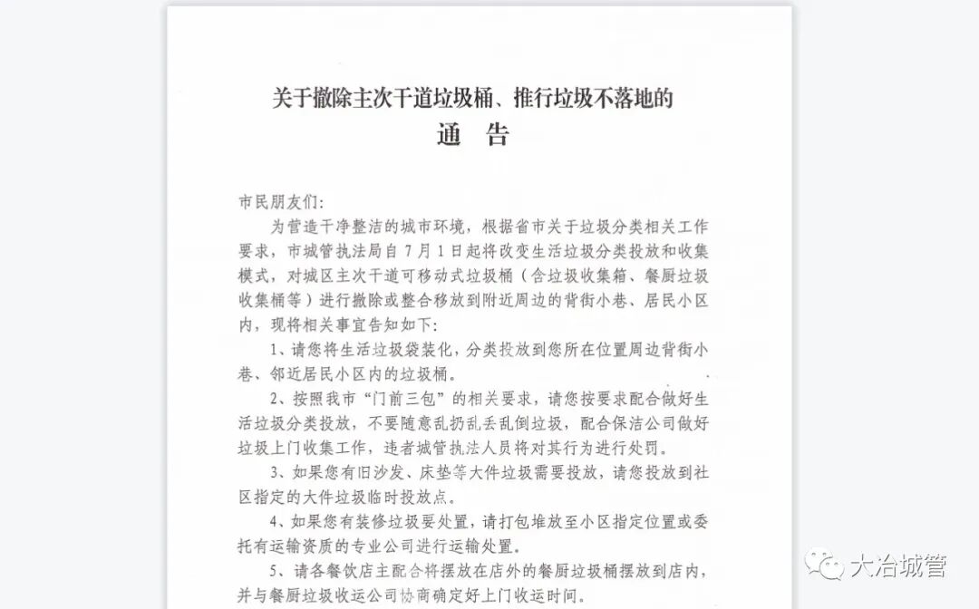 《关于撤除主次干道垃圾桶、推行垃圾不落地的通告》