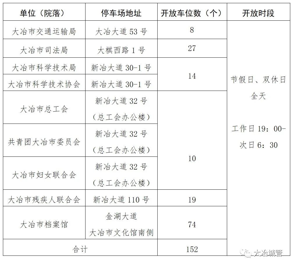 为充分发挥城区机关事业单位现有内部停车场作用,有效缓解社会停车难问题,市政府决定自2023年4月12日起,以下单位(院落)内部停车场地将适时免费向社会开放(仅限7座以下及车高1.8米以下的小型客车),现予以公告。