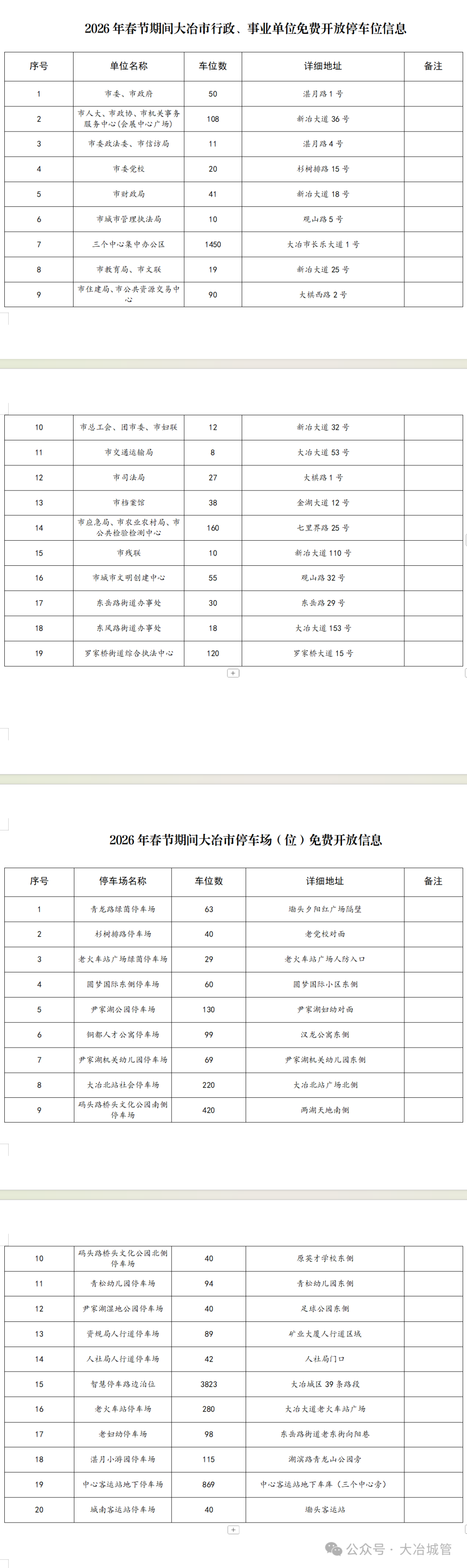 为切实缓解2026年春节期间城区停车压力,方便群众探亲访友、出行游玩,营造欢乐祥和、畅通有序的节日氛围,在2月15日20:00---2月24日8:00春节期间城区部分停车场(位)向社会免费开放,以提升市民的幸福感和获得感,大冶市“停车惠民”工作领导小组办公室通告如下: