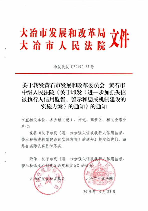 冶发改发〔2019〕25号2019年进一步加强失信被执行人信用监督、警示和惩戒机制建设的实施方案