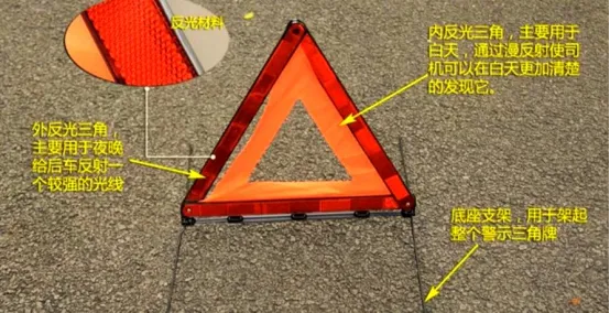 三角警告牌由反光三角、荧光三角和底座构成。夜间,外层的反光三角在汽车灯光的照射下,能反射出强烈的光线,提醒后方车辆注意避让。而内层的荧光三角则在白天发挥其作用,通过漫反射让司机在明亮的环境中也能清晰发现三角警告牌的存在。