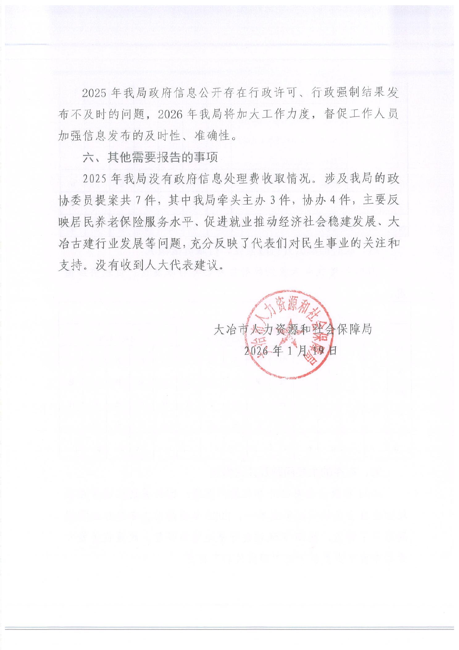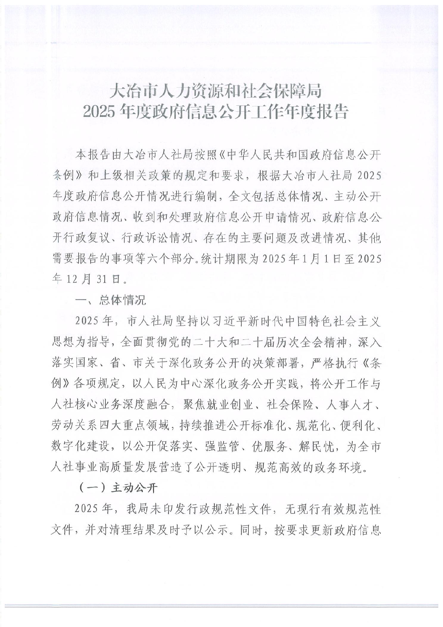 大冶市人力资源和社会保障局2025年度政府信息公开工作年度报告