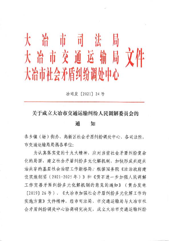 关于成立大冶市交通运输纠纷人民调解委员会的通知1.jpg