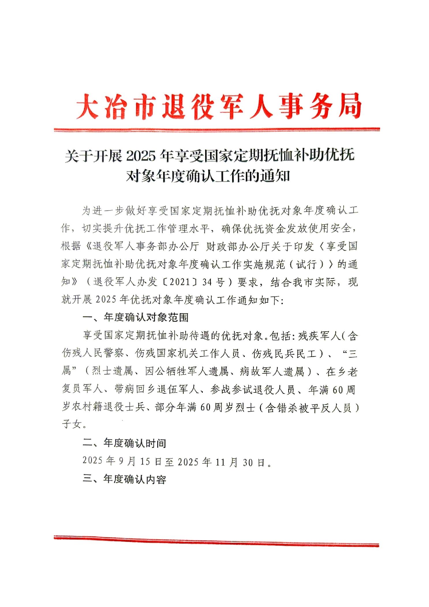关于开展2025年享受国家定期抚恤补助优抚对象年度确认工作的通知