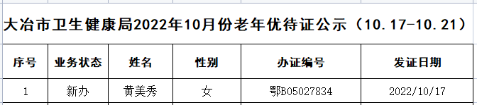 大冶市卫生健康局2022年10月份老年优待证公示(10.17-10.21)