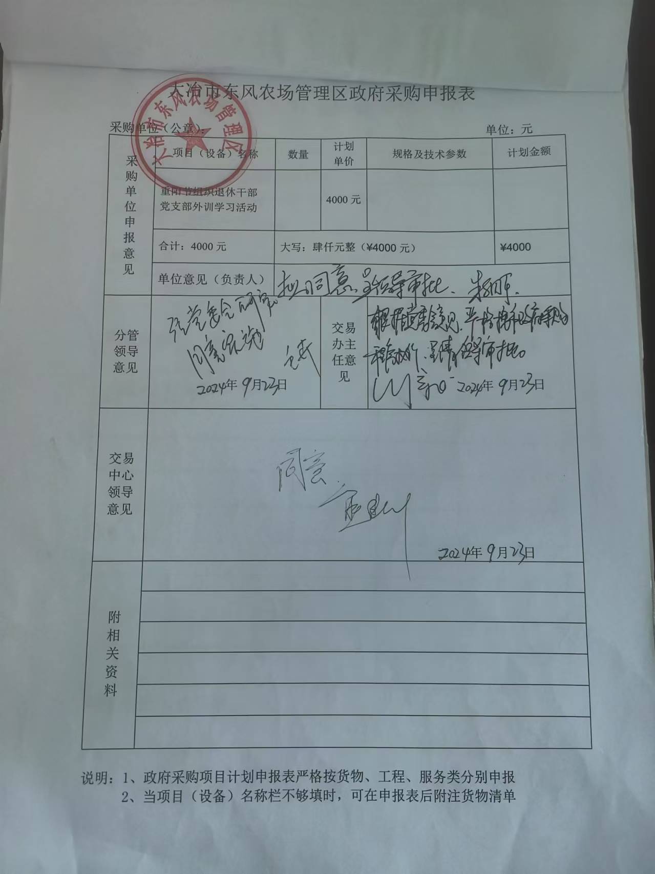 东风农场关于老年党支部外训学习采购申报表