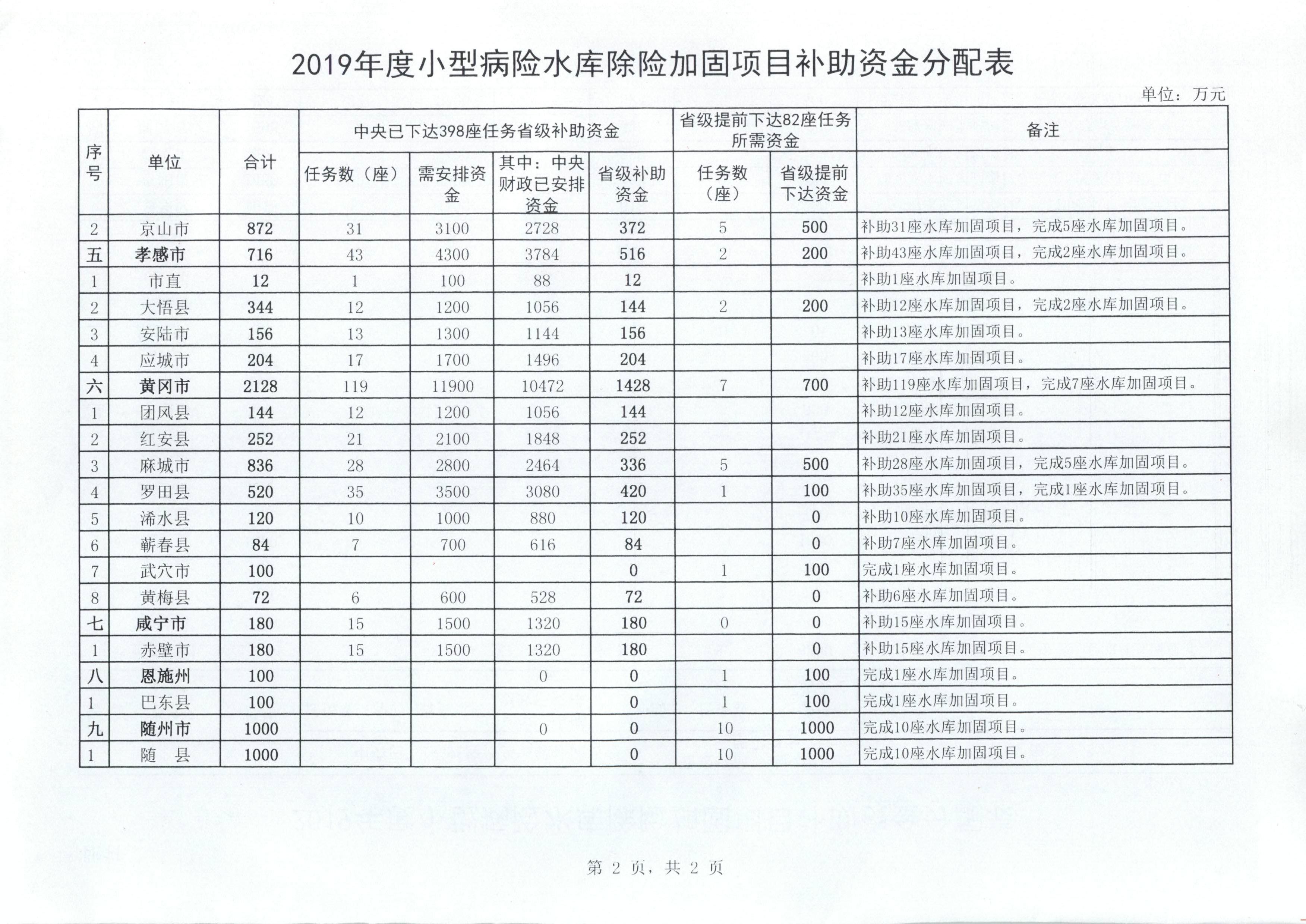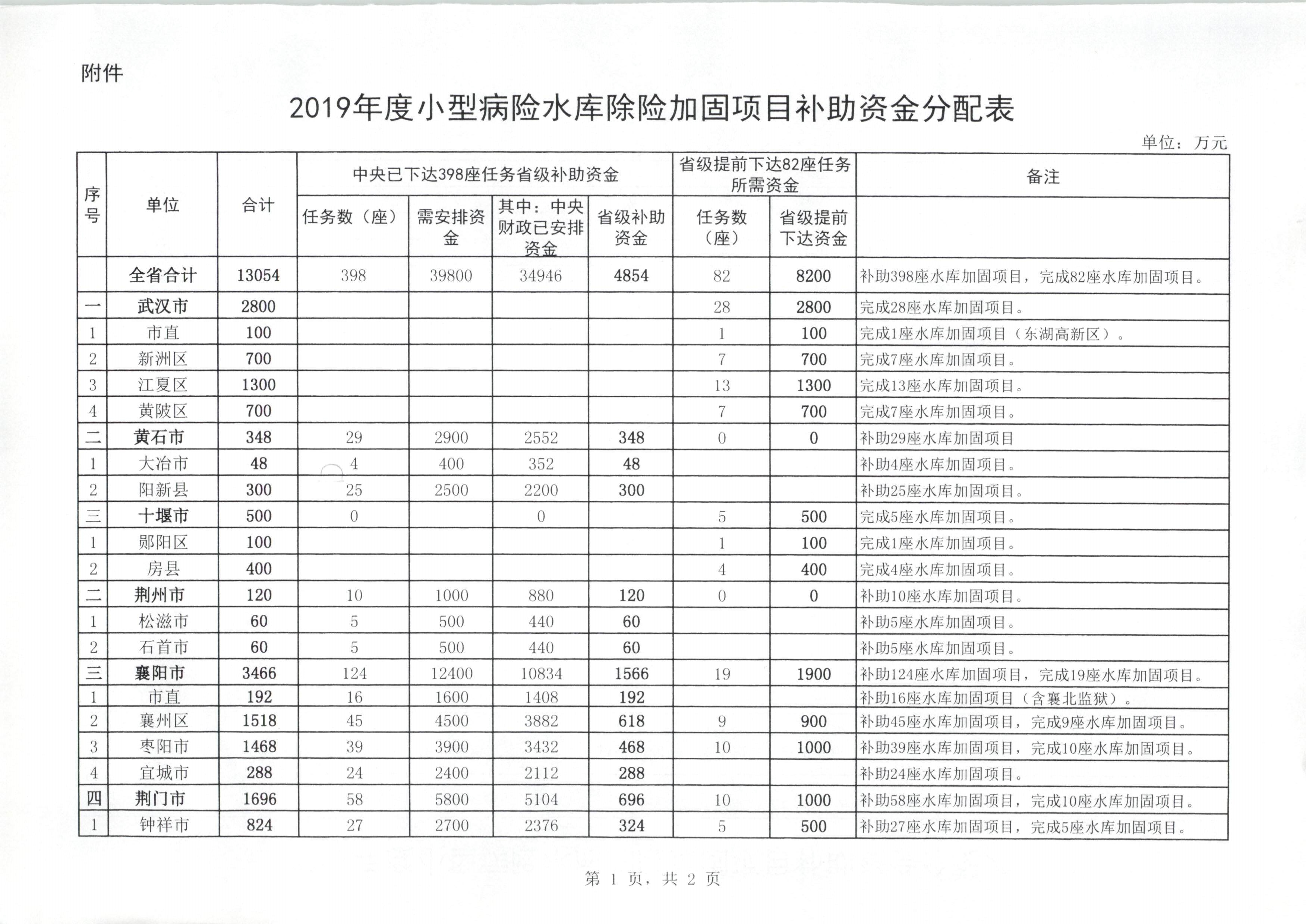 根据省财政厅《关于拨付2019年小型病险水库除险加固补助资金的通知》(鄂财农发〔2019〕33号)文件精神,湖北省下达我市财政水库除险加固专项资金48万元。按照省财政厅印发的《湖北省中央财政水利发展资金使用管理实施细则》(鄂财农规(2017)5号)文件精神,结合我市年度水库除险加固规划,现对湖北省下达我市2019年财政资金予以公示,该笔资金将用于2019年度实施的王家山等四座水库除险加固工程,该笔资金接受群众和社会监管。