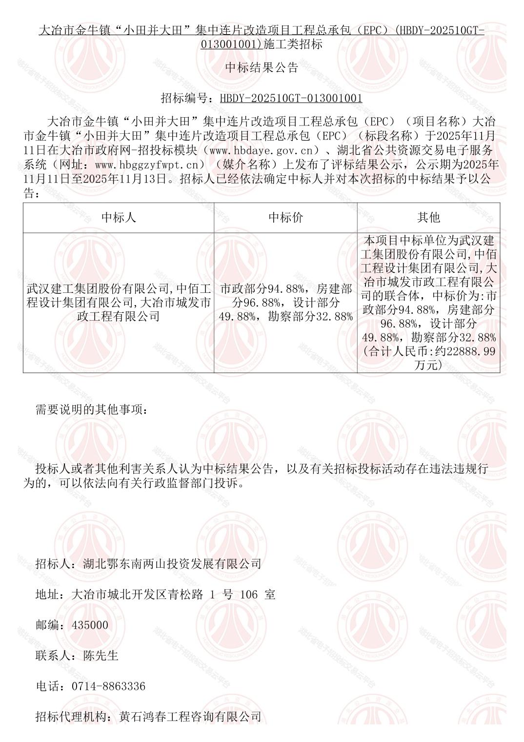 大冶市金牛镇“小田并大田”集中连片改造项目工程总承包(EPC)中标结果公告