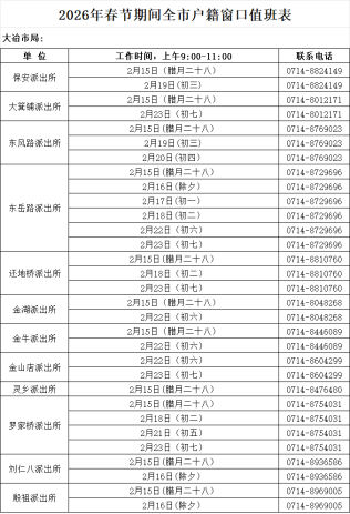 针对春节返乡办证高峰,公安部门对业务量较大的派出所实行弹性错时与节日值班相结合的服务模式,统一向社会公布户政值班电话与服务日期。群众因返乡、出行、急用证件等特殊情况,需在非工作时间办理户政业务的,可提前拨打值班电话预约办理,确保急事急办、特事特办。