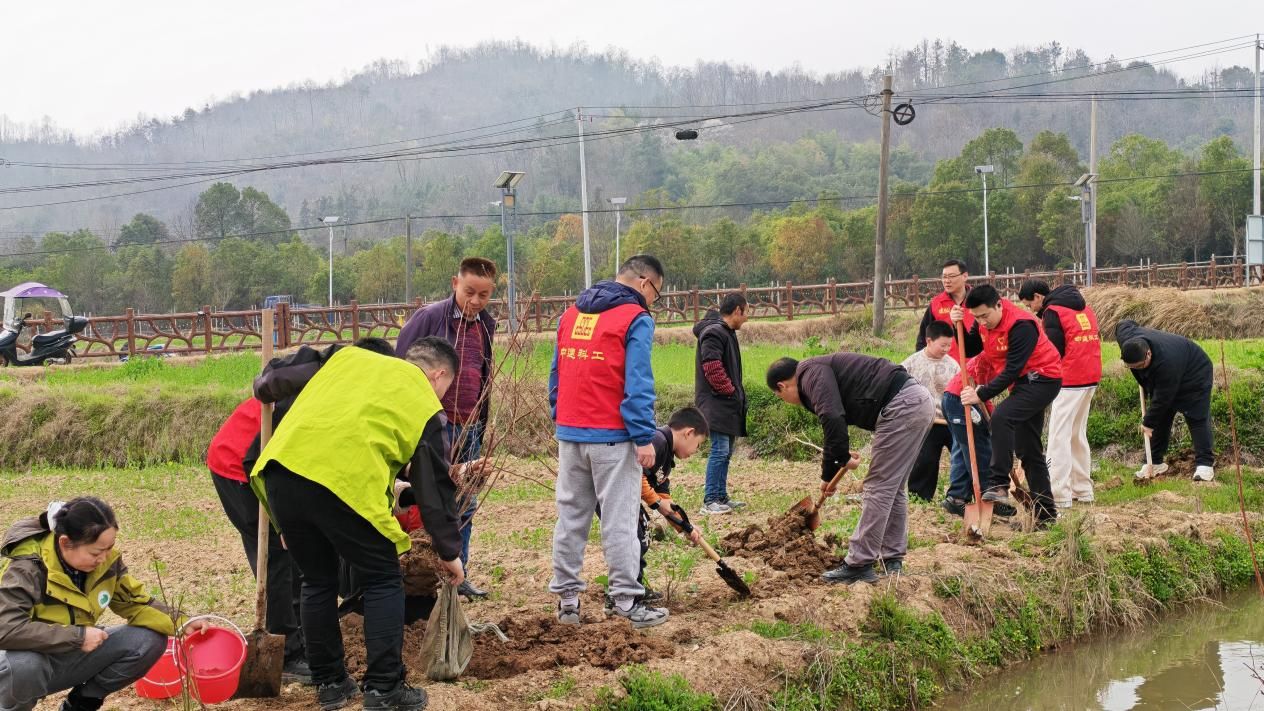 当天,50余名党员干部、志愿者及村民代表齐聚风桥村农耕研学基地,大家分工协作,挥锹挖坑、种下树苗、培土压实、提水浇灌,现场成功栽种砂糖橘、桑葚、蓝莓等果树100余株。活动中,志愿者们还对沿线树干进行涂白处理,为树木穿上“防护衣”。同时,每一位参与者都积极参与果树认养,并亲手挂上专属认养牌。