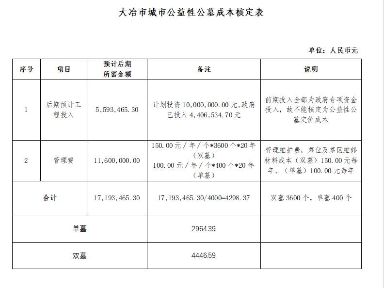 经审计,大冶市城市公益性公墓4000个,定价成本(全部为建成后预计必要配套建设及管理费用投入成本,不包括前期政府专项资金投入建设等成本)最终核定为1719.35万元,定价成本为:双墓4,446.59元/个、单墓2,964.39元/个。