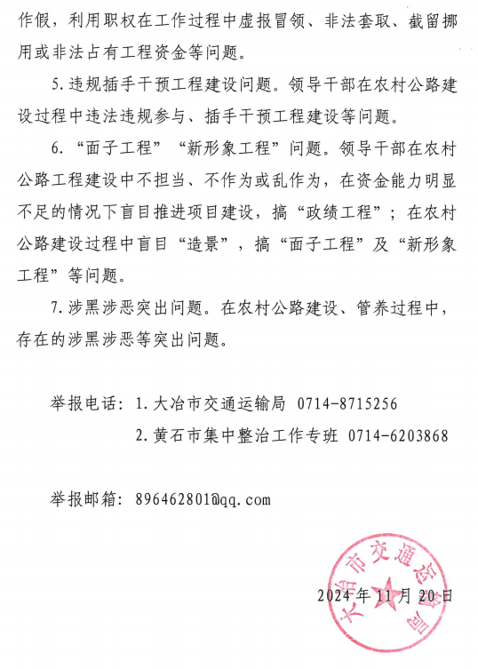 关于进一步公开征集大冶市农村公路建设领域群众身边不正之风和腐败问题线索的公告