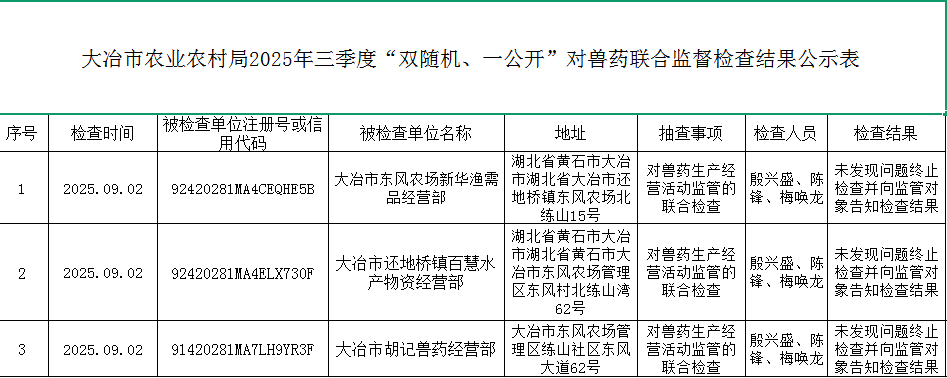大冶市农业农村局2025年三季度“双随机、一公开”对兽药联合监督检查结果公示表