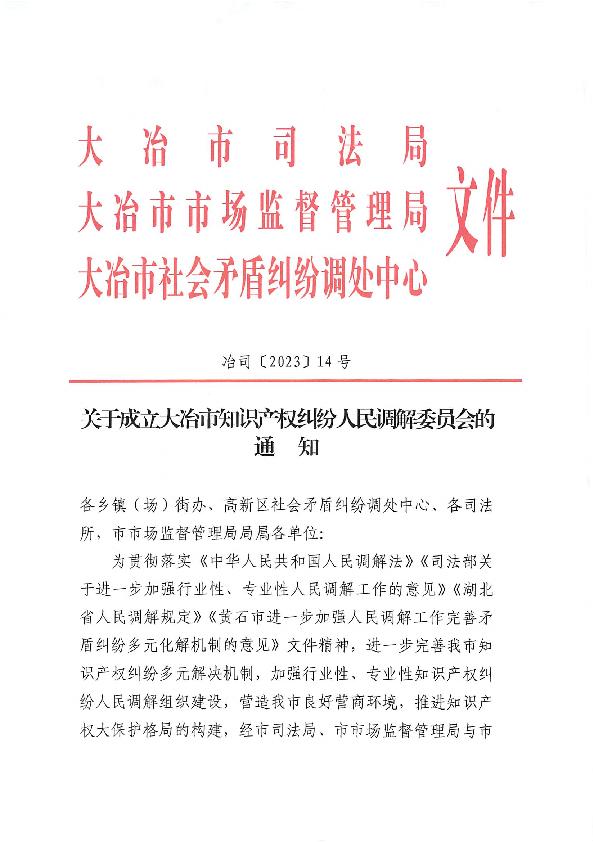 关于成立大冶市知识产权纠纷人民调解委员会的通知1.jpg