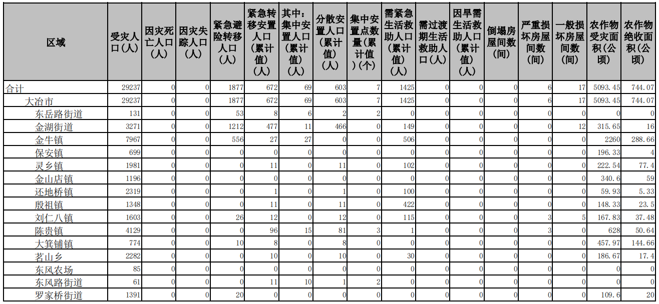 大冶市2024年度阶段性(1-11月)灾情统计表