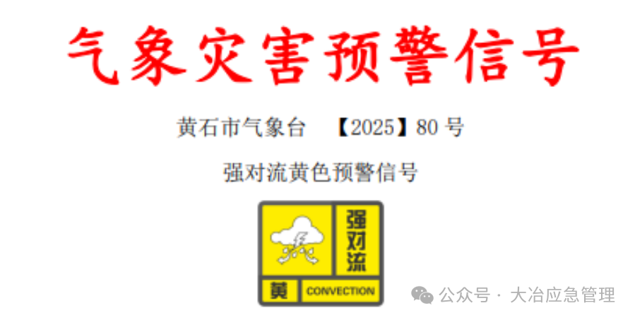 黄石市气象台2025年6月27日3时18分发布强对流黄色预警信号:受对流云团影响,预计今天凌晨至上午,黄石地区将出现雷暴大风、短时强降水等强对流天气,阵风8级以上并伴有雷电,最大小时雨强20-40毫米,有一定致灾风险,请注意防范!