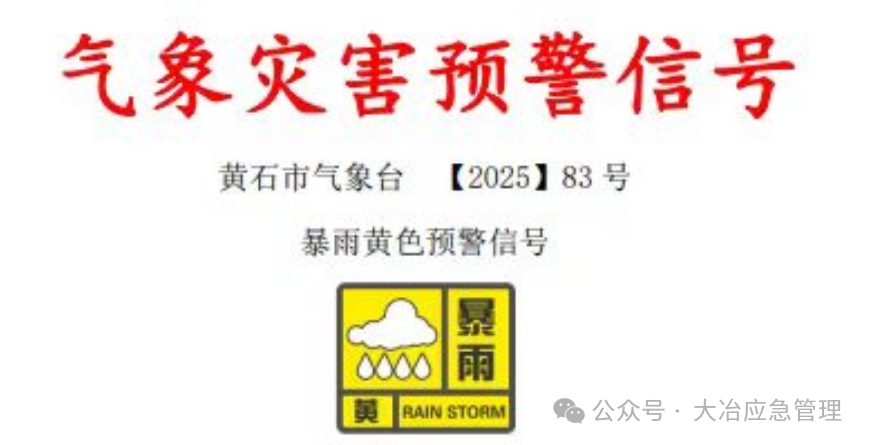 黄石市气象台2025年6月27日7时01分发布暴雨黄色预警信号:受降雨云团影响,预计今天早上至上午,黄石城区、阳新将出现大雨到暴雨,累计雨量40-60毫米,并伴有雷电,山区山洪、地质灾害、城乡积涝、中小河流洪水风险较高,请注意防范!