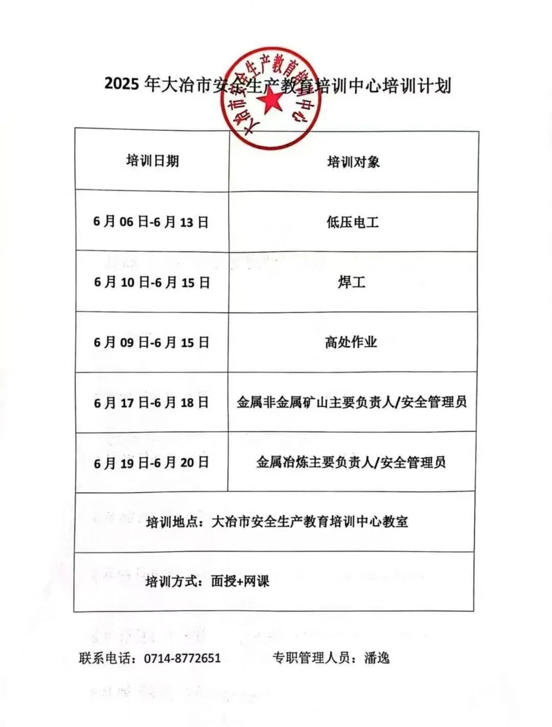 为扎实做好安全生产教育培训工作,帮助企业主要负责人、安全管理人员、特种作业人员持证上岗,特将大冶市安全生产教育培训中心5月份安全培训计划予以公布,有需要的企业和从业人员,尽快与安全培训中心联系(8771689,8772651)。