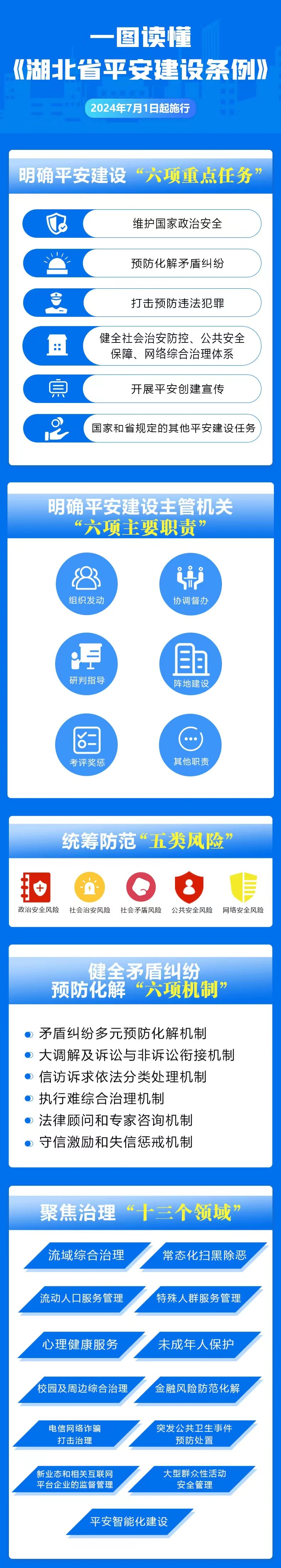 2024年3月27日,湖北省第十四届人民代表大会常务委员会第九次会议审议通过了《湖北省平安建设条例》,自2024年7月1日起施行。