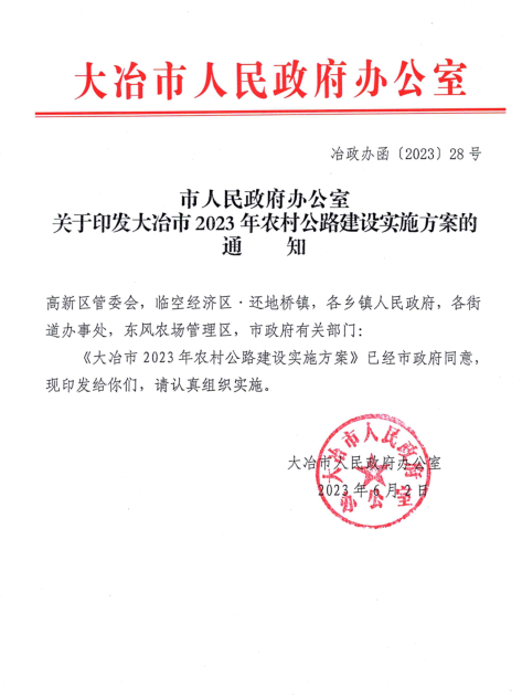 冶政办函〔2023〕28号关于印发大冶市2023年农村公路建设实施方案的通知