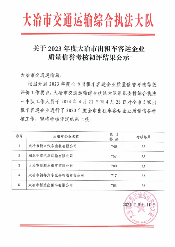 关于2023年度大冶市出租车客运企业质量信誉考核初评结果公示