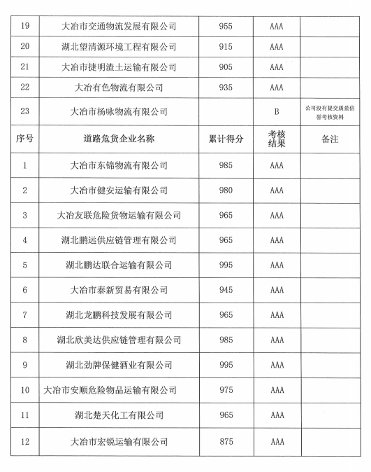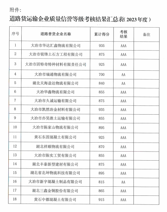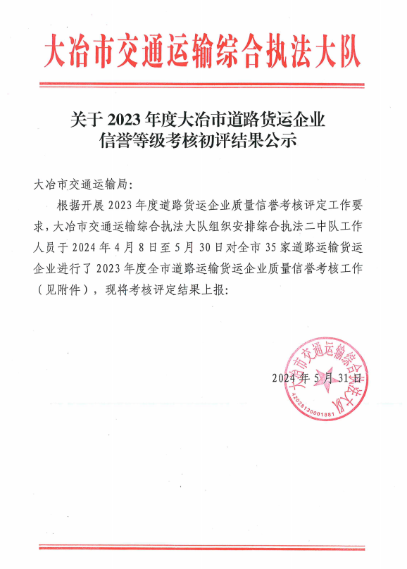 关于2023年度大冶市道路货运企业信誉等级考核初评结果公示