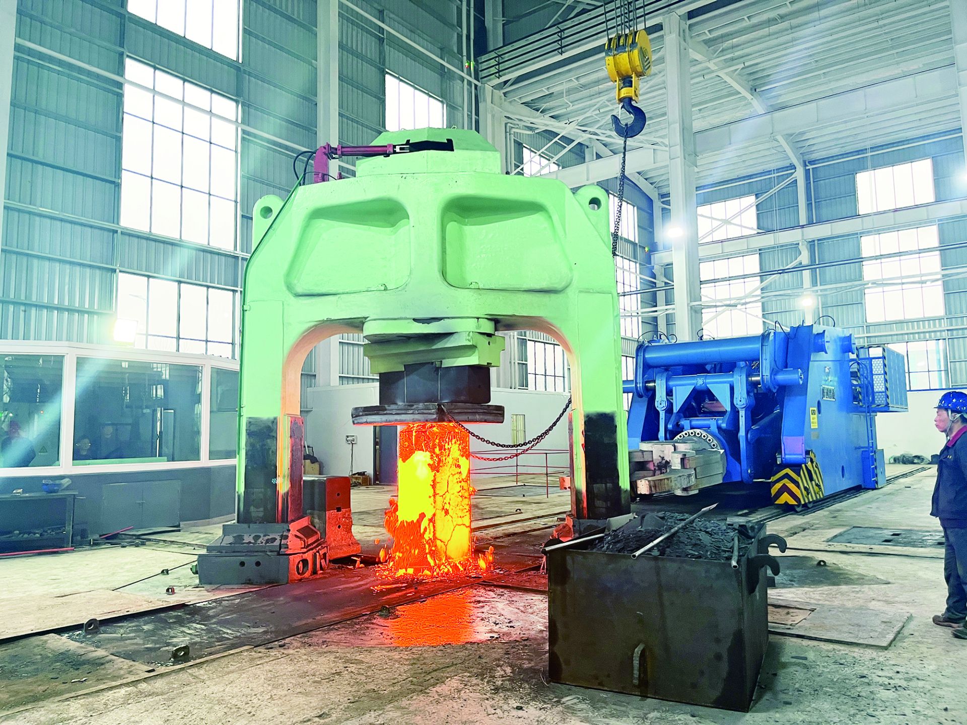 “这台设备的系统是由一台20MN快速锻造液压机和一台200KN/600KNm全液压锻造操作机组成。它的快锻频率达到60-80次/分、控制精度在±1毫米之间;在压机和操作机联动状态下,可实现无人操作,从根本上提高产品质量、改善锻造车间的劳动环境。”永舟新材料综合部部长王震林介绍道。