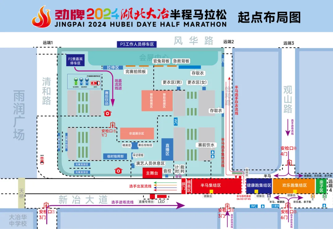 健康跑和欢乐跑选手请尽量从2、3、4号安检口检录入场,根据所报名项目的集结柱的引导,进入对应的集结区。健康跑选手在图中蓝色区域集结,欢乐跑选手在图中橙色区域集结。