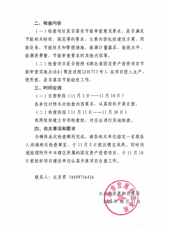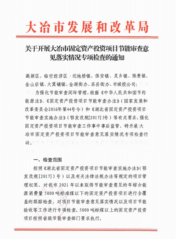 关于开展大冶市固定资产投资项目节能审查意见落实情况专项检查的通知