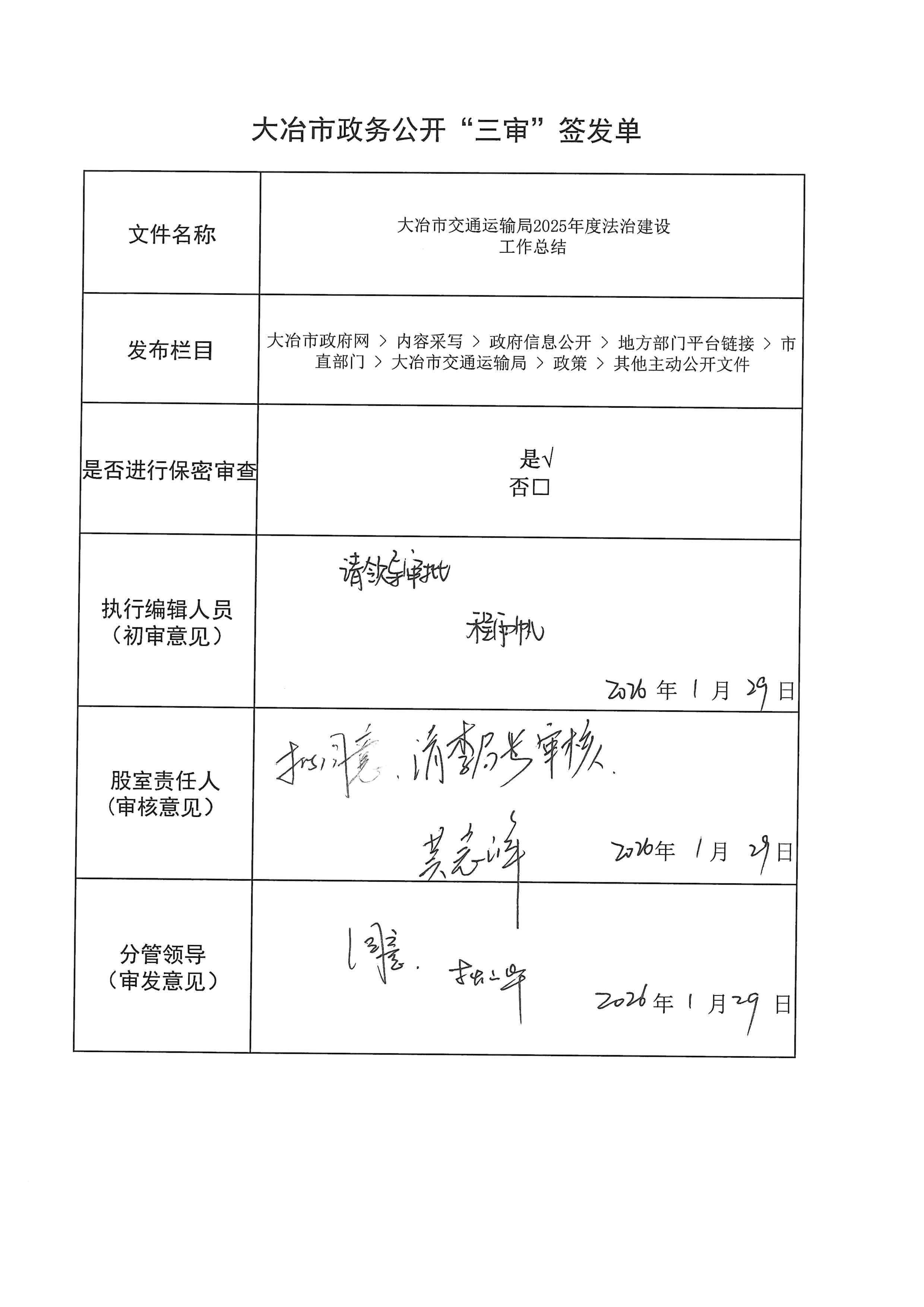 2025年是“十四五”规划收官、“十五五”谋篇关键之年,市交通运输局在市委、市政府的正确领导和上级部门的业务指导下,坚持以习近平新时代中国特色社会主义思想为指导,全面贯彻党的二十大和二十届二中、三中全会精神,深入践行习近平法治思想,紧扣“十四五”规划收官目标,聚焦优化法治化营商环境,结合“八五”普法规划要求,扎实推进法治交通建设,不断提升行业治理效能,为我市交通运输行业高质量发展筑牢法治根基。现将2025年度法治建设工作情况总结如下: